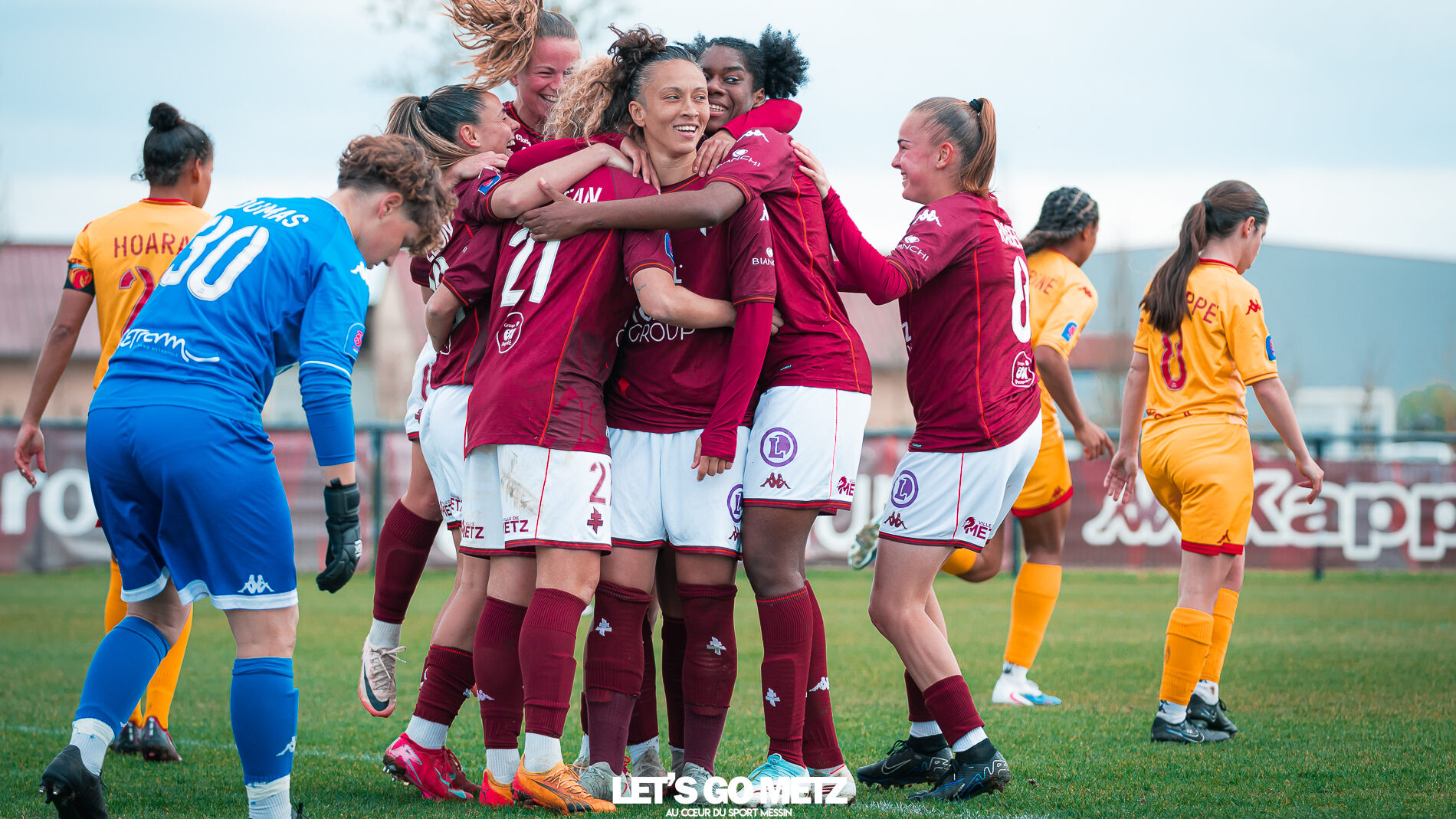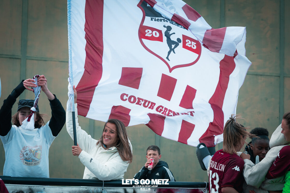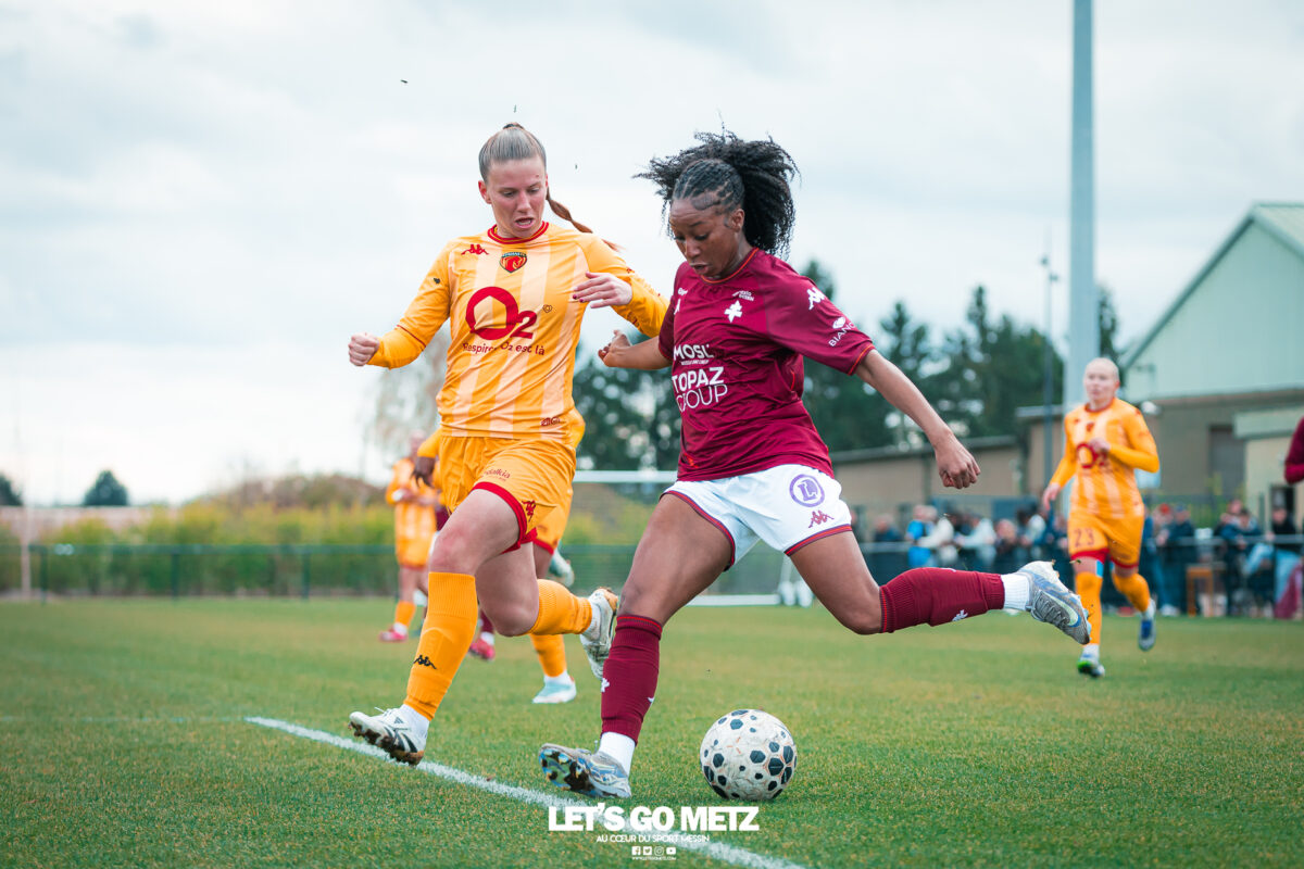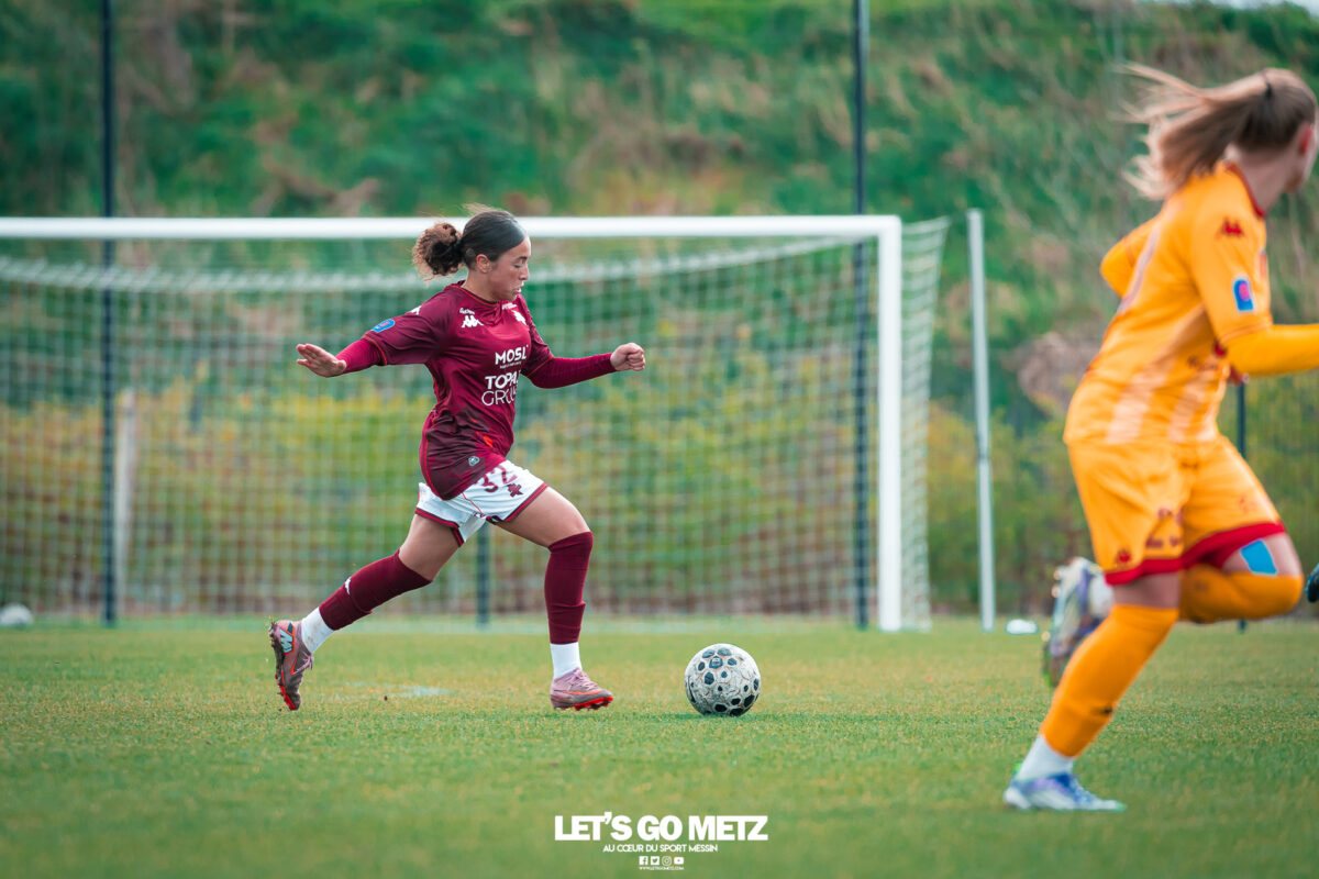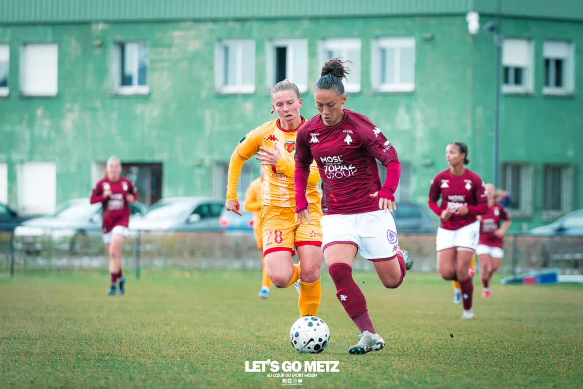 75 Le FC Metz s’est imposé 3 buts à 0 face au Mans FC ce dimanche à Frescaty. Les Messines ont enfin sorti la tête de l’eau en mettant fin à une longue spirale négative. La course au maintien en Seconde Ligue est plus que jamais lancée. Les Messines retrouvent enfin la saveur de la victoire ! Le FC Metz (11ème) a reçu Le Mans FC (4ème) ce dimanche pour la dix-huitième journée de Seconde Ligue. Une rencontre ô combien importante pour la coach Marine Morel et ses joueuses, en quête de points. Alors que la sonnette d’alarme a été tirée, il y a quelques jours, après la chute du club dans la zone de relégation, les Mosellanes n’avaient pas d’autres choix que d’obtenir un résultat contre Le Mans FC. D’autant plus que Rodez, juste devant au classement, aurait pu creuser l’écart avec sa victoire à Guingamp (1-2). Une belle entame de match Ce dimanche, c’est grâce à une surprenante équipe de Metz que les féminines se sont extirpées du piège de cette dix-huitième journée. Elles ont parfaitement réussi leur entame de match en montrant un tout autre visage. Anais Ribeyra a ouvert la voie à ses coéquipières en inscrivant le premier but de la rencontre (1-0, 25′). Puis Metz s’est servi de son temps fort pour alourdir le score. Sur corner, Maria Fodil a profité d’un dégagement hasardeux des visiteuses pour armer une reprise de volée qui a laissé de marbre la portière mancelle (2-0, 29′). Un ouf de soulagement pour les Messines qui ont explosé de joie après ce deuxième but. Le Mans FC n’est pas parvenu à réduire l’écart avant la pause laissant le FC Metz rentrer au vestiaire avec deux longueurs d’avance. De retour pour la seconde période avec le plein de confiance, les Messines n’ont pas voulu en rester là. À nouveau sur corner, Maud Antoine a tiré profit d’un énième cafouillage défensif des Mancelles pour prendre l’avantage dans les airs et adresser un ballon à Clara Petitjean qui, de la tête, a inscrit le troisième but messin (3-0, 50′). En moins d’une heure, le FC Metz a plié le match, ne laissant aucun espoir aux Mancelles. Les joueuses de Marine Morel ont parfaitement géré la fin de rencontre en maintenant la cage inviolée. Une équipe joyeuse et des supporters heureux après cette belle victoire face au Mans FCCrédit photo : Julien Buret / Let’s Go Metz Une victoire qui doit en appeler d’autres Un succès 3 buts à 0 pour les Messines qui mettent fin à une longue spirale négative. Elles n’avaient plus gagné en championnat depuis le 7 décembre dernier, et c’était déjà contre la même équipe du Mans FC (1-2). Un adversaire qui sourit au FC Metz cette saison. Malgré cette victoire, les Mosellanes ne sortent toujours pas de la zone rouge à cause du résultat de Rodez. Deux petits points séparent désormais les deux clubs, la course au maintien s’annonce excitante. Il reste quatre journées, quatre finales au FC Metz pour arracher le maintien en Seconde Ligue. Elles débuteront par un déplacement au Stade de Reims le samedi 25 avril prochain. Reste à savoir si ce succès à domicile permettra aux Messines de relever la tête et d’enchaîner une deuxième victoire de suite. FC Metz 3 – 0 Le Mans FC Mi-temps : 2-0Buts pour Metz : Ribeyra (25′), Fodil (29′), Petitjean (50′)Composition du FC Metz : Lebrun, Antoine (Mbengue, 81′), Petitjean (Jacob, 70′), Rageot, Ngambu Ngiangi, Thivillon, Munier (c), Fodil, Ben Khaled (Djebli, 88′), Ribeyra (Dayes, 70′), BouktitComposition du Mans FC : Dumas, Roger (Palene, 62′), Philippe, Ibrahim (Favennec, 62′), Chabourine (Huet, 71′), Hoarau, Bekhti (Galode, 62′), Dechilly, Faity, Bourdoiseau, Chapelle Crédit photos : Julien Buret / Let’s Go Metz
