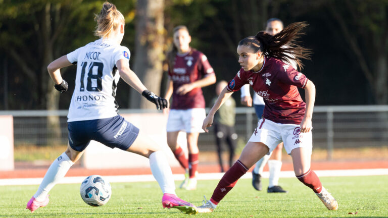 1,8K Les joueuses du FC Metz ont été tenues en échec par leurs homologues de Thonon Évian. Match nul 0-0 pour le dernier match à domicile de l’année 2024 des Grenats. À défaut de pouvoir gagner, il faut savoir ne pas perdre. Face à un adversaire bien regroupé en défense et rapide dans ses transitions, les joueuses du club à la Croix de Lorraine n’ont guère été inquiétées, mais n’ont malheureusement pas su trouver la faille. Un match nul 0-0 entre le FC Metz et Thonon Évian pour ce dernier match de l’année à Dezavelle, qui rassure autant qu’il déçoit. Au rayon des bons points, les Messines ont su stopper l’hémorragie après trois défaites consécutives et ce triste revers face à Toulouse quinze jours plus tôt. Du côté des déceptions, il a manqué beaucoup de choses aux Grenats pour espérer repartir avec les trois points. Le FC Metz est désormais neuvième au classement de Seconde Ligue et se laisse petit à petit rattraper par Rodez et Orléans, deux des trois futurs adversaires des protégées de Marine Morel. Un bon point de pris ? Il y aura ceux qui voient le verre à moitié plein, et les autres. Certes, après trois défaites consécutives, il était important pour les Messines de retrouver de la sérénité défensive et une certaine solidité. Le piège des Évianaises, d’une évidence manifeste, ne s’est fort heureusement pas refermé sur les Grenats. Les rares incursions des visiteuses en contre-attaque furent bien jugulées par une solide défense du duo Clara Petitjean – Maud Antoine. Julie Genty a bien dû s’employer à quelques reprises, mais dans l’ensemble, Thonon ne s’est jamais montré très dangereux. Pour autant, les manques dans le jeu proposé par les protégées de Marine Morel ont été bien trop nombreux aujourd’hui pour espérer inquiéter leurs adversaires. Entre imprécisions et mauvais choix, les Messines ont longtemps piétiné dans cette rencontre. Si, en première mi-temps, Léa Munier a bien failli tromper la gardienne d’Évian sur une frappe en cloche, les situations de but furent aussi rares que les schémas de passes réussis en milieu de terrain. Sans réellement montrer d’envie de presser leur adversaire, les Grenats n’ont offert au public de Dezavelle qu’une partition moyenne, avec quelques rares débordements et des centres mal ajustés. Il fallait attendre le second acte pour voir enfin des joueuses investies et un pressing plus haut sur le terrain. Un sursaut d’orgueil et un football retrouvé, sous les encouragements crescendo des supporters messins, mais qui intervenaient bien trop tard dans la rencontre. Quinze minutes qui ne suffirent malheureusement pas aux joueuses de Metz pour trouver la faille. Dommage. Première titularisation pour Assia Bouktit C’était l’une des sensations du jour à Dezavelle, la première titularisation d’Assia Bouktit. La jeune attaquante du FC Metz, récompensée pour son travail par Marine Morel, n’aura malheureusement pas réussi à trouver le chemin des filets. Mais l’ex-joueuse d’Amnéville a tout donné, sous les yeux bienveillants de sa mère et de sa sœur, Sarah Bouktit, vice-championne olympique avec l’équipe de France de handball, qui s’est arrêtée au micro de Let’s Go Metz : « Lorsqu’avec Metz Handball, on joue le samedi, je peux aller voir Assia jouer le dimanche à domicile. J’aime beaucoup le football et j’adore suivre ma sœur. Aujourd’hui c’est sa première titularisation depuis qu’elle est au FC Metz. C’est un grand jour ! » La pivot des Dragonnes ne cache pas sa fierté de voir Assia gravir les échelons : « Les seuls conseils que je peux lui apporter concernent l’état d’esprit, car elle connaît bien mieux le foot que moi. Depuis le début, je lui dis de ne rien lâcher. Elle a un parcours atypique et a subi des situations difficiles, notamment quand elle ne jouait pas du tout, et j’ai essayé d’être là pour elle et lui dire que si elle continuait à travailler, ça allait payer un jour. » Les réactions de Mélissa Bethi et Marine Morel Prochain rendez-vous des Grenats, dans une semaine sur la pelouse du LOSC. Un déplacement une nouvelle fois périlleux qu’il faudra bien négocier. FC Metz : Genty, Lambert (Ou Mahi 80′), Petitjean, Antoine, Feddaoui (Olivieira Bras 71′), Munier (Jacob 90′), Rougemont, Bethi, Joseph, Bouktit (Thivillon 46′), BoutalebThonon Évian : Danjou, Trevisan, Palma, Botobsky, Clerac, Zemzem, Ladhani, Stephen, Nicot, Priol, Esposito Crédit photos : Julien Buret – Let’s Go Metz