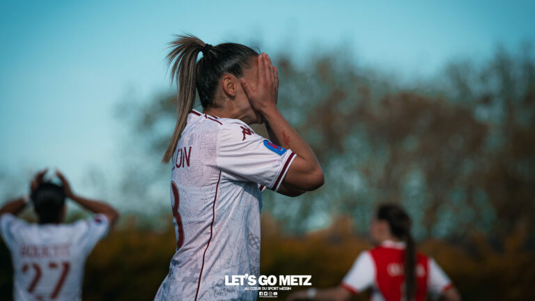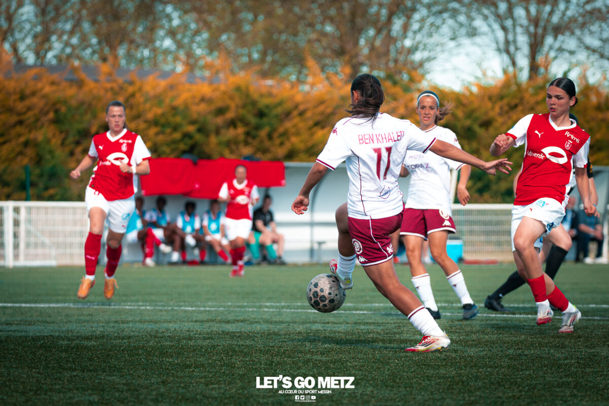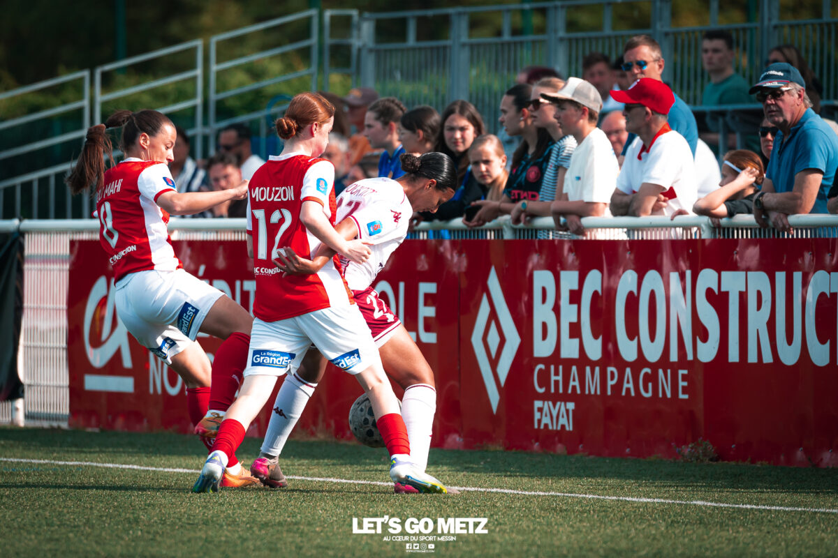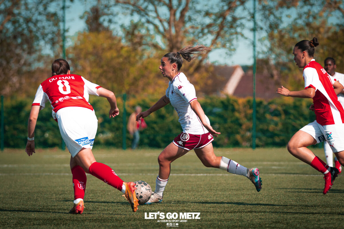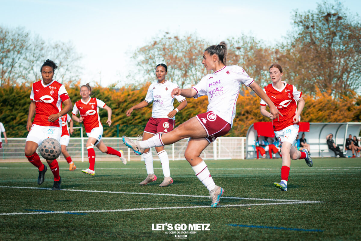 272 Les joueuses du FC Metz ont loupé le coche samedi à Reims lors de la dix-neuvième journée de Seconde Ligue Féminine. Lourde défaite 4-1 des protégées de Marine Morel. L’opération maintien se complique sérieusement. L’addition est salée et la défaite amère. Malgré une indéniable domination pendant les deux-tiers de la rencontre, les féminines du FC Metz ont lourdement chuté sur la pelouse du Stade de Reims ce samedi, lors de la dix-neuvième journée du championnat de Seconde Ligue. Maladroites dans le dernier geste en première mi-temps, les Grenats se sont d’abord faites prendre en contre juste avant la pause sur un but d’Alizée Mereau (44′). En seconde période, si les débats se sont équilibrés, les protégées de Marine Morel ont tout tenté pour égaliser à l’image d’Anaïs Ribeyra, meilleur atout offensif de Metz, mais qui n’aura trouvé que les montants de la gardienne rémoise ce samedi. Le coup de massue arrivait, contre toute attente, au début du dernier quart d’heure lorsque Léa Bourgain doublait la mise pour le Stade de Reims (76′), annihilant par la même occasion les espoirs grenat. Alizée Mereau (84′) et Hanna’a Chamsoudine (88′) achevaient ensuite cruellement et définitivement leur proie. Le but pour l’honneur de Mikayla Dayes avant le coup de sifflet final n’était malheureusement plus qu’anecdotique. Score final 4-1. Dur à encaisser tant les joueuses du club à la Croix de Lorraine ont montré de belles qualités face à des Rémoises patientes et opportunistes. Rodez est désormais à trois points La défaite du FC Metz à Reims n’est évidemment pas sans conséquences, alors qu’il ne reste que trois matchs à disputer. À la lutte à distance avec Rodez, les Messines avaient l’opportunité de rejoindre leurs concurrentes directes aveyronnaises, tout en dépassant Reims. Au lieu de ça, les Messines voient Reims s’envoler à cinq longueurs et Rodez prendre un point de plus après leur magnifique prestation face aux championnes toulousaines. Les Ruthénoises, qui avaient d’abord ouvert la marque, encaissaient ensuite quatre buts de Toulouse en première mi-temps. Mais avec une force de caractère exemplaire, les joueuses de Rodez revenaient à hauteur des Violettes aux termes d’un combat épique qui pourrait bien être fondateur pour cette fin de saison. Avec dix-huit points, le FC Metz n’est donc plus maître de son destin et devra non seulement faire un résultat dès dimanche prochain face à Auxerre (Troisième et toujours en lice pour la montée) mais également espérer un faux pas de Rodez à Saint-Malo (Dauphin de Toulouse). Une délicate position de chasseur pour les Grenats, à qui il reste trois rencontres pour se sauver. L’urgence est donc toujours absolue pour toute la section féminine qui va jouer son avenir lors de ce mois de mai de tous les dangers. Prochain rendez-vous, dimanche 03 mai à 15h00, au stade Dezavelle, pour un FC Metz- AJ Auxerre qui promet d’être électrique. Crédit photos : Julien Buret/Let’s Go Metz