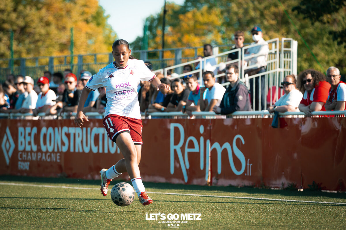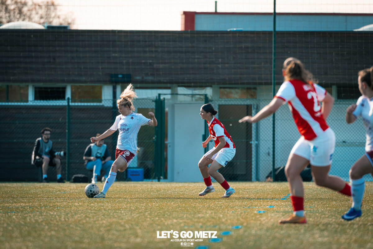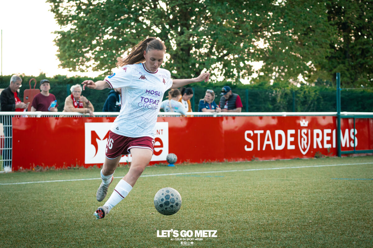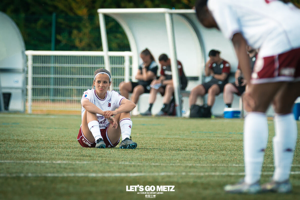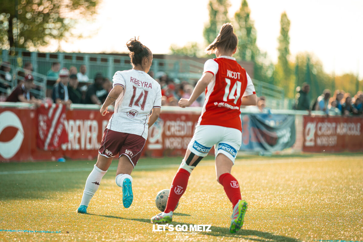 272 Les joueuses du FC Metz ont loupé le coche samedi à Reims lors de la dix-neuvième journée de Seconde Ligue Féminine. Lourde défaite 4-1 des protégées de Marine Morel. L’opération maintien se complique sérieusement. L’addition est salée et la défaite amère. Malgré une indéniable domination pendant les deux-tiers de la rencontre, les féminines du FC Metz ont lourdement chuté sur la pelouse du Stade de Reims ce samedi, lors de la dix-neuvième journée du championnat de Seconde Ligue. Maladroites dans le dernier geste en première mi-temps, les Grenats se sont d’abord faites prendre en contre juste avant la pause sur un but d’Alizée Mereau (44′). En seconde période, si les débats se sont équilibrés, les protégées de Marine Morel ont tout tenté pour égaliser à l’image d’Anaïs Ribeyra, meilleur atout offensif de Metz, mais qui n’aura trouvé que les montants de la gardienne rémoise ce samedi. Le coup de massue arrivait, contre toute attente, au début du dernier quart d’heure lorsque Léa Bourgain doublait la mise pour le Stade de Reims (76′), annihilant par la même occasion les espoirs grenat. Alizée Mereau (84′) et Hanna’a Chamsoudine (88′) achevaient ensuite cruellement et définitivement leur proie. Le but pour l’honneur de Mikayla Dayes avant le coup de sifflet final n’était malheureusement plus qu’anecdotique. Score final 4-1. Dur à encaisser tant les joueuses du club à la Croix de Lorraine ont montré de belles qualités face à des Rémoises patientes et opportunistes. Rodez est désormais à trois points La défaite du FC Metz à Reims n’est évidemment pas sans conséquences, alors qu’il ne reste que trois matchs à disputer. À la lutte à distance avec Rodez, les Messines avaient l’opportunité de rejoindre leurs concurrentes directes aveyronnaises, tout en dépassant Reims. Au lieu de ça, les Messines voient Reims s’envoler à cinq longueurs et Rodez prendre un point de plus après leur magnifique prestation face aux championnes toulousaines. Les Ruthénoises, qui avaient d’abord ouvert la marque, encaissaient ensuite quatre buts de Toulouse en première mi-temps. Mais avec une force de caractère exemplaire, les joueuses de Rodez revenaient à hauteur des Violettes aux termes d’un combat épique qui pourrait bien être fondateur pour cette fin de saison. Avec dix-huit points, le FC Metz n’est donc plus maître de son destin et devra non seulement faire un résultat dès dimanche prochain face à Auxerre (Troisième et toujours en lice pour la montée) mais également espérer un faux pas de Rodez à Saint-Malo (Dauphin de Toulouse). Une délicate position de chasseur pour les Grenats, à qui il reste trois rencontres pour se sauver. L’urgence est donc toujours absolue pour toute la section féminine qui va jouer son avenir lors de ce mois de mai de tous les dangers. Prochain rendez-vous, dimanche 03 mai à 15h00, au stade Dezavelle, pour un FC Metz- AJ Auxerre qui promet d’être électrique. Crédit photos : Julien Buret/Let’s Go Metz