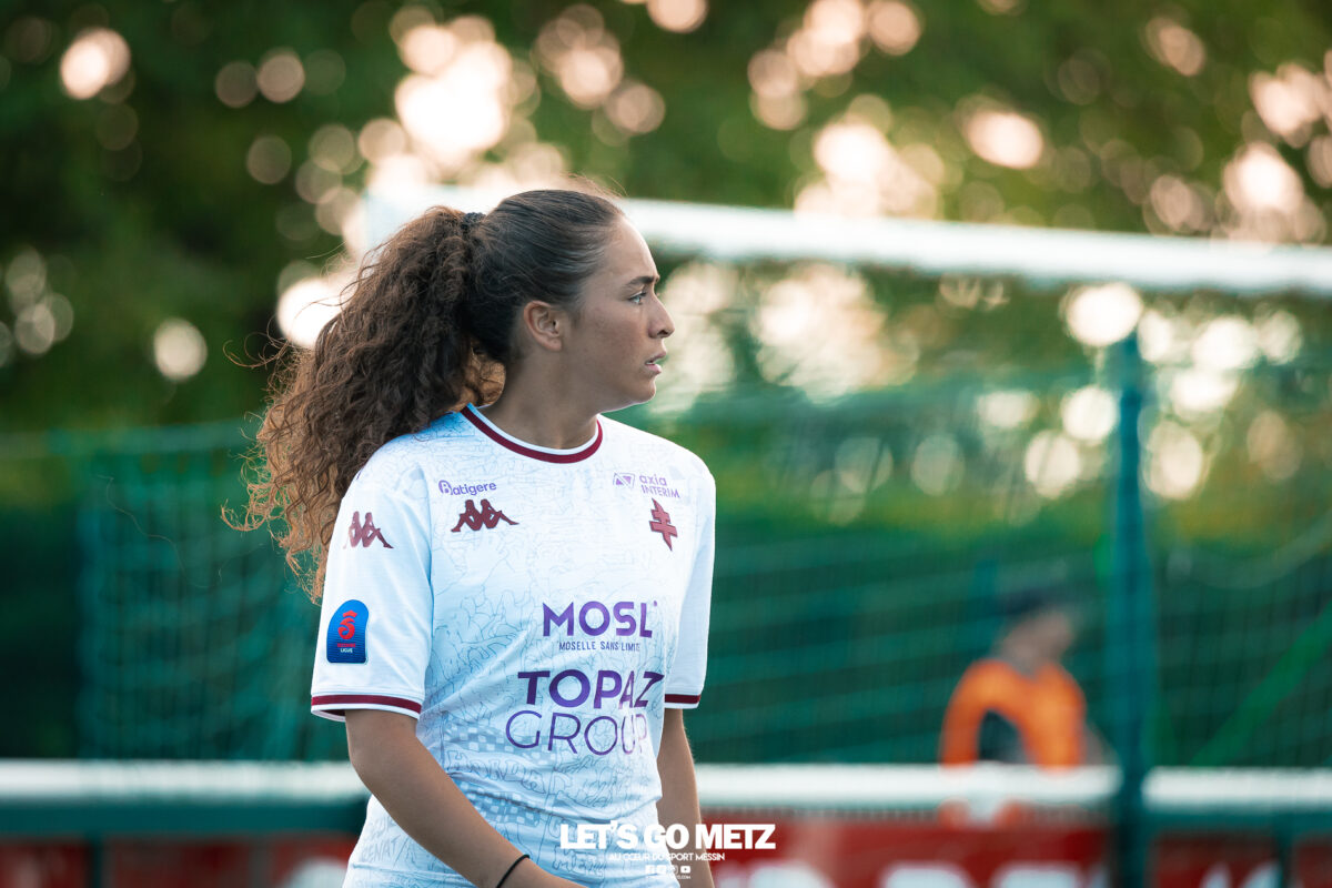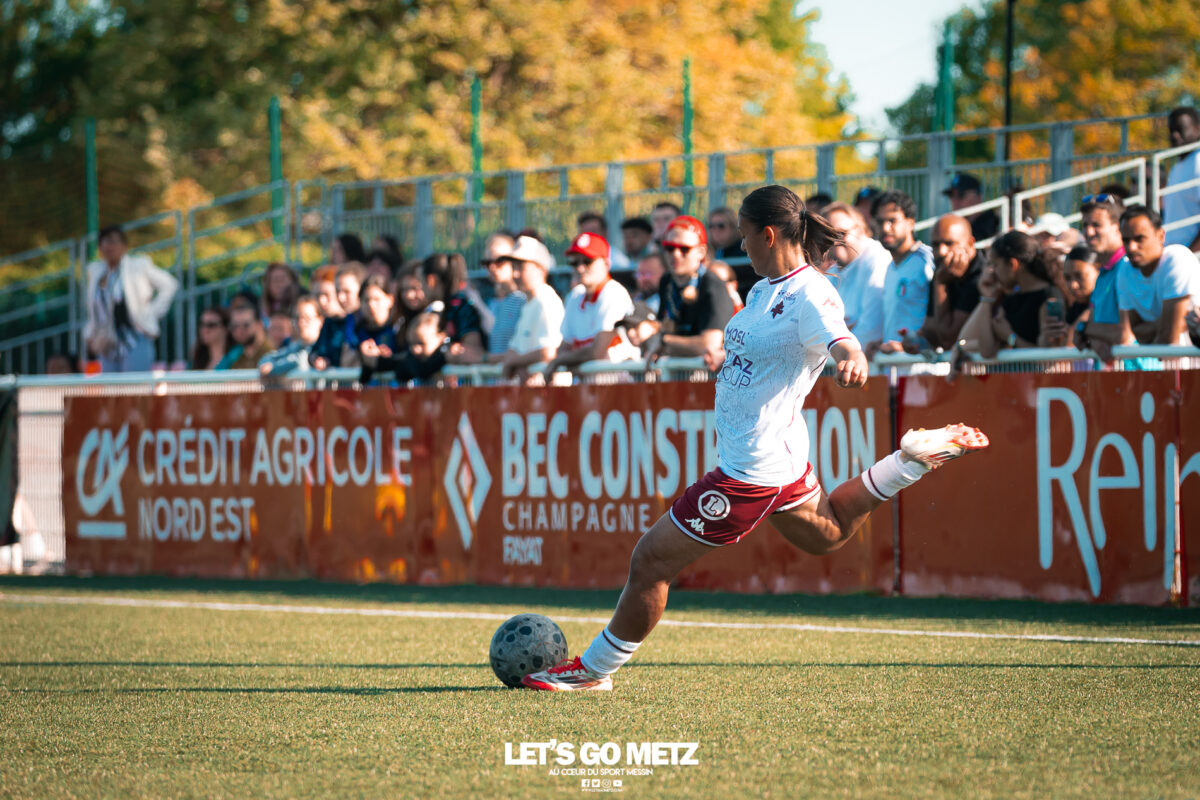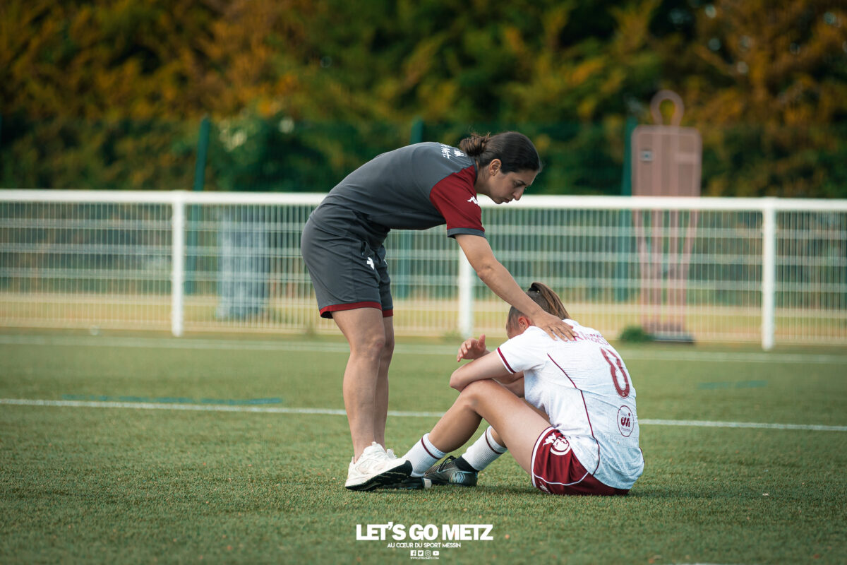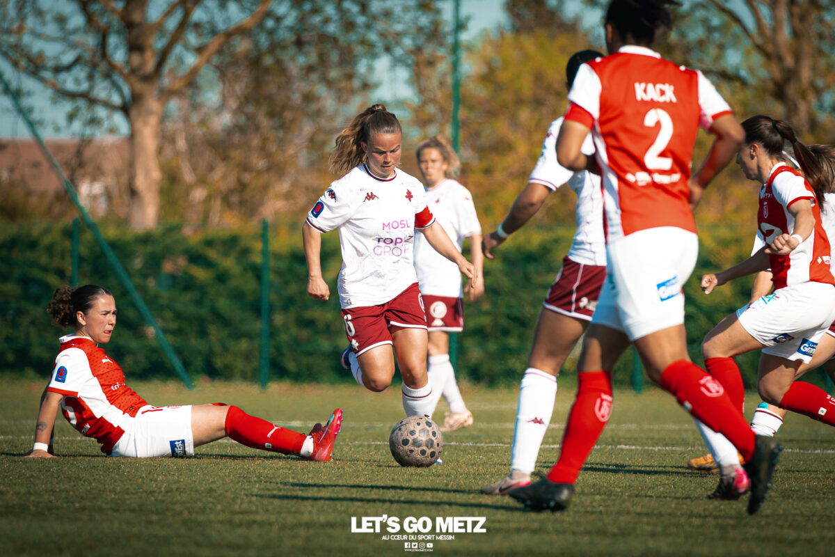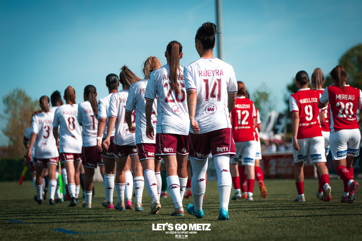 272 Les joueuses du FC Metz ont loupé le coche samedi à Reims lors de la dix-neuvième journée de Seconde Ligue Féminine. Lourde défaite 4-1 des protégées de Marine Morel. L’opération maintien se complique sérieusement. L’addition est salée et la défaite amère. Malgré une indéniable domination pendant les deux-tiers de la rencontre, les féminines du FC Metz ont lourdement chuté sur la pelouse du Stade de Reims ce samedi, lors de la dix-neuvième journée du championnat de Seconde Ligue. Maladroites dans le dernier geste en première mi-temps, les Grenats se sont d’abord faites prendre en contre juste avant la pause sur un but d’Alizée Mereau (44′). En seconde période, si les débats se sont équilibrés, les protégées de Marine Morel ont tout tenté pour égaliser à l’image d’Anaïs Ribeyra, meilleur atout offensif de Metz, mais qui n’aura trouvé que les montants de la gardienne rémoise ce samedi. Le coup de massue arrivait, contre toute attente, au début du dernier quart d’heure lorsque Léa Bourgain doublait la mise pour le Stade de Reims (76′), annihilant par la même occasion les espoirs grenat. Alizée Mereau (84′) et Hanna’a Chamsoudine (88′) achevaient ensuite cruellement et définitivement leur proie. Le but pour l’honneur de Mikayla Dayes avant le coup de sifflet final n’était malheureusement plus qu’anecdotique. Score final 4-1. Dur à encaisser tant les joueuses du club à la Croix de Lorraine ont montré de belles qualités face à des Rémoises patientes et opportunistes. Rodez est désormais à trois points La défaite du FC Metz à Reims n’est évidemment pas sans conséquences, alors qu’il ne reste que trois matchs à disputer. À la lutte à distance avec Rodez, les Messines avaient l’opportunité de rejoindre leurs concurrentes directes aveyronnaises, tout en dépassant Reims. Au lieu de ça, les Messines voient Reims s’envoler à cinq longueurs et Rodez prendre un point de plus après leur magnifique prestation face aux championnes toulousaines. Les Ruthénoises, qui avaient d’abord ouvert la marque, encaissaient ensuite quatre buts de Toulouse en première mi-temps. Mais avec une force de caractère exemplaire, les joueuses de Rodez revenaient à hauteur des Violettes aux termes d’un combat épique qui pourrait bien être fondateur pour cette fin de saison. Avec dix-huit points, le FC Metz n’est donc plus maître de son destin et devra non seulement faire un résultat dès dimanche prochain face à Auxerre (Troisième et toujours en lice pour la montée) mais également espérer un faux pas de Rodez à Saint-Malo (Dauphin de Toulouse). Une délicate position de chasseur pour les Grenats, à qui il reste trois rencontres pour se sauver. L’urgence est donc toujours absolue pour toute la section féminine qui va jouer son avenir lors de ce mois de mai de tous les dangers. Prochain rendez-vous, dimanche 03 mai à 15h00, au stade Dezavelle, pour un FC Metz- AJ Auxerre qui promet d’être électrique. Crédit photos : Julien Buret/Let’s Go Metz