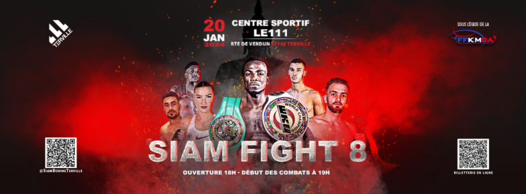Le Siam Fight 8 aura lieu le samedi 20 janvier 2024 au 111 de Terville et mettra à l’honneur le Muay Thai et le Kickboxing à travers divers combats professionnels et amateurs.