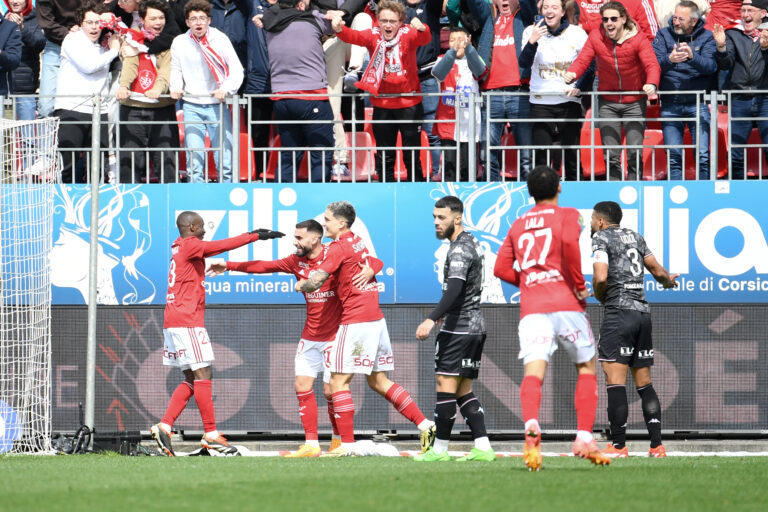 1,3K Un déplacement périlleux attendait le FC Metz en Finistère, ce dimanche 7 avril, face à l’étonnant Stade Brestois. Après un match spectaculaire, les Grenats se sont inclinés par la plus petite des marges, 3-4. Trois buts marqués, cela ne suffit toujours pas pour cette équipe et cela rajoute encore un peu plus de frustration à son parcours en Ligue 1. Il fallait absolument réagir, ne pas se laisser griser par la morosité ambiante, renouer avec un semblant d’espoir. Capitaliser, aussi, sur les quelques satisfactions de cette infâme prestation à domicile contre l’AS Monaco : Koffi Kouao, Arthur Atta. Profiter des retours de certains cadres, suspendus ou blessés : Danley Jean Jacques, Didier Lamkel Zé. Il fallait bien tout ce mélange pour pouvoir prétendre rivaliser avec le Stade Brestois, deuxième de Ligue 1, invaincu depuis huit matchs et meilleure défense des cinq grands championnats européens (!) depuis décembre 2023. Mais en se déplaçant à Brest, il ne fallait pas oublier un ingrédient essentiel : jouer. Au football. Si les locaux ont bien saisi l’enjeu de la rencontre, les Messins, eux, n’ont guère existé à ce jeu-là pendant une majeure partie de la rencontre. Et lorsque le réveil était finalement amorcé, il était une nouvelle fois trop tard. Six minutes avant de tirer le rideau… Tout avait pourtant si bien commencé. Alors que Grenats et Ty Zefs entamaient leur round d’observation, Lamine Camara provoquait un corner après une course folle depuis son propre camp. Ce dernier trouvait Ismaël Traoré qui, profitant du laxisme finistérien, reprenait le ballon du pied gauche pour la mettre au fond (0-1, 6′). Stupeur dans les travées de Francis-Le Blé, qui ne s’attendait pas à une telle entame. Mais les Bretons ne tardaient pas à réagir et, sur un nouveau corner, Brendan Chardonnet reprenait de volée une tête défensive manquée et égalisait six petites minutes plus tard. Sonnés, les Messins allaient ensuite sombrer face à la justesse technique de la bande à Romain Del Castillo, Pierre Lees-Melou et autres Steve Mounié. Une-deux, passes tranchantes, appels dangereux… Les Bretons faisaient tourner en bourrique des Messins complètement dépassés. Puis, à force de pousser et bien aidés par un marquage fort léger, ils trouvaient la faille par deux fois avec Doumbia (2-1, 30′) et Mounié (3-1, 38′). Photo : Sandra Ruhaut/Icon Sport. Voilà le FC Metz complètement retombé dans ses travers. Il finissait par encaisser un neuvième but en deux matchs durant la seconde période, sur un autre corner réceptionné par Satriano et laissant de marbre Alexandre Oukidja (4-1, 60′). La suite de la rencontre, au beau milieu des « Olé » du stade Francis Le-Blé, aurait pu paraître anecdotique si les Brestois, forts de leur avance, n’avaient pas troqué leur sérieux contre de la dilettante. Alors que le FC Metz touchait le fond, les entrées de Kevin Van den Kerkhof et Cheick Tidiane Sabaly redonnaient de l’allant aux Grenats. Puis le Stade Brestois entrait dans un surprenant passage à vide qui permettait aux Grenats de retrouver la lumière… et de marquer deux buts plein de sang froid, grâce à Georges Mikautadze (4-2, 74′, 4-3, 79′). Jouant à se faire peur, les Brestois se limitaient ensuite à jouer « à la Messine » avec un bloc bas, proche de la surface du gardien Marco Bizot. Quinze minutes de souffrance mais de résistance, avant une salvatrice délivrance pour des Bretons qui continuent donc leur épopée en haut du classement. Le FC Metz paie cher ses absences On ne compte plus le nombre de fois où les joueurs du FC Metz paient cher ces petits détails : ce marquage manqué par-ci, cette passe cadeau à l’adversaire par là. On ne compte plus, aussi, le nombre de fois où Laszlo Bölöni exprime sa « frustration » en conférence de presse d’après-match. « On savait qu’on allait avoir des moments difficiles quand l’adversaire allait pousser et presser. » Ce que l’entraîneur roumain n’imaginait pas, c’était l’invisibilité totale de son milieu de terrain en première période. Hormis Arthur Atta, auteur d’une prestation convaincante avec une passe décisive à la clé, ses compagnons d’infortune ont été soit invisibles, soit trop laxistes, à l’instar d’un Danley Jean Jacques laissant filer son vis-à-vis sans réaction. Conséquence : Brest a eu tout le loisir de développer son jeu sans rencontrer de réelle opposition. « On a perdu la bataille du milieu de terrain avec tellement de facilité, de déséquilibre. On a couru n’importe où, n’importe comment, et lorsqu’il fallait être là où le jeu le demandait, on n’était pas présents », concède Laszlo Bölöni. Photo : Sandra Ruhaut/Icon Sport Or, les absences étaient également défensives, à l’image d’un Matthieu Udol passé à côté de son match. Face au duo Kenny Lala/Romain Del Castillo, le capitaine messin a eu beaucoup de mal à s’imposer et résister à leur vivacité. Par ailleurs, son marquage superficiel a facilité les deuxième et troisième buts du Stade Brestois, laissant tout le loisir à Del Castillo de délivrer deux caviars pour ses attaquants. Globalement et à l’image du chef de file, beaucoup de tensions se ressentaient au sein de l’effectif du FC Metz sur la pelouse. Les errements des uns irritaient les autres, et vice versa. Ablie Jallow, auteur d’une prestation insuffisante et remplacé à l’heure de jeu, a quitté la pelouse sans saluer son coach ni ses coéquipiers sur le banc. Les symptômes persistants d’une équipe impuissante, somme toute. Nouvelle cartouche grillée pour les Grenats en Bretagne. Il reste désormais six matchs pour recoller à la position de barragiste et espérer une issue autre que celle qui semble décidée depuis des semaines. Face au Racing Club de Lens vendredi 12 avril à 21 h, le FC Metz aura l’occasion de créer à nouveau 