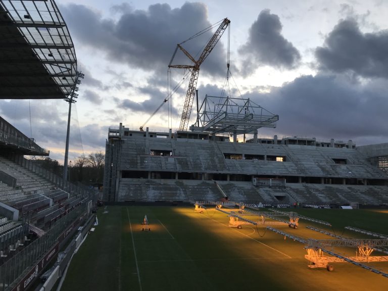 446 Ce mercredi, la tribune Sud a commencée à se revêtir pour l’hiver. Voici quelques clichés des travaux du jour :