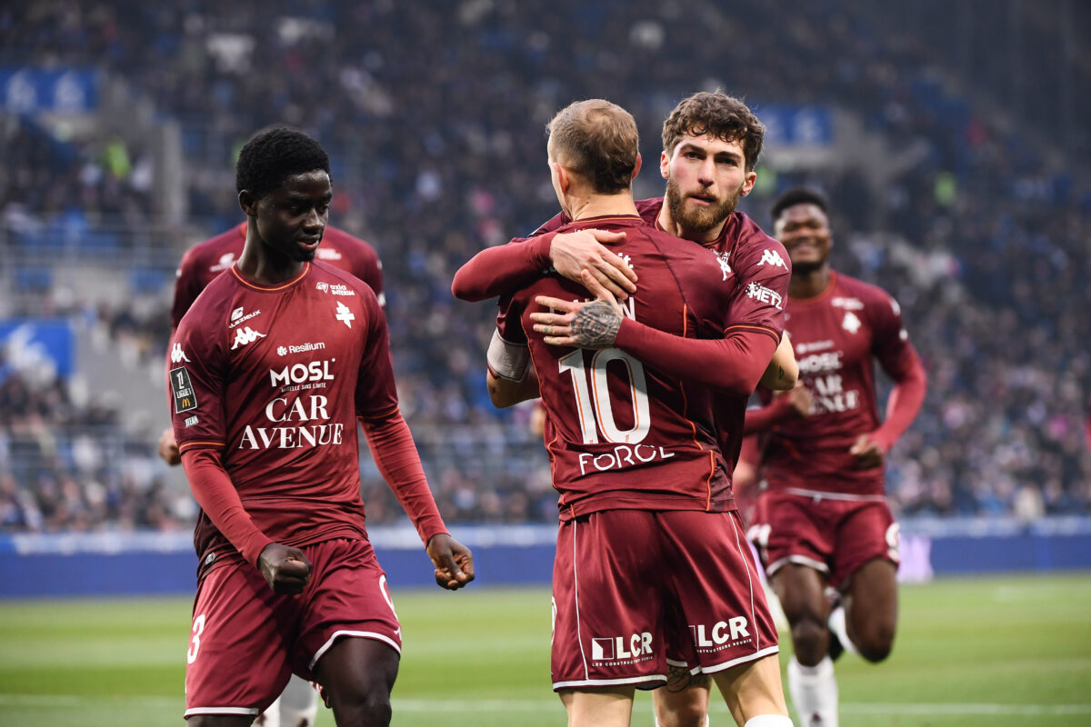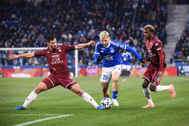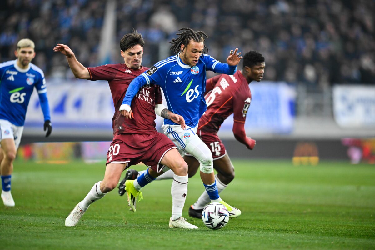 142 Le derby de l’Est reste encore une fois alsacien. Le FC Metz s’est incliné face au Racing Club de Strasbourg (2-1) ce dimanche 18 janvier mais le visage affiché par les joueurs a été beaucoup moins indigent que lors de la rencontre précédente. Déjà ça, mais ça ne rapporte pas de point… On attendait sans doute moins une victoire qu’une réaction après l’humiliation en Coupe de France face à Montpellier. Le FC Metz a rempli sa part de la mission mais n’a pas pu faire davantage face au Racing dans cette nouvelle rencontre entre deux rivaux historiques aux rapports de plus en plus déséquilibrés ces dernières années. Malgré une équipe strasbourgeoise loin des attentes et du talent exprimé en début de saison, le différentiel technique et physique est resté encore une fois trop important ce dimanche pour espérer revenir de la Meinau avec un résultat qui aurait pu relancer les affaires messines au classement. Des intentions intéressantes, un rendement trop faible Ce n’est pourtant pas faute d’avoir essayé de faire bouger les lignes, notamment par une approche tactique différente, tantôt 5-3-2, tantôt 4-2-3-1, avec un Jean-Philippe Gbamin positionné au milieu de terrain. D’avoir aussi tenté de profiter des espaces souvent laissés par les Alsaciens en contre ou même, sur certaines phases de jeu en seconde période, monopoliser le ballon. « Les intentions étaient là, on a vu dès l’entame de match qu’on était là pour essayer de poser des soucis à l’équipe de Strasbourg, ne pas faire que défendre », commente Stéphane Le Mignan. Mais le manque de créativité dans le jeu et la faible menace offensive des Grenats – malgré la combativité d’Ibou Sané – n’ont pu faire mouche. Et si le retour de Habib Diallo et Cheikh Sabaly – sur lesquels l’entraîneur souhaite compter pour la prochaine réception de l’OL – sera fortement bienvenu mais pas suffisant. « Il faut qu’on arrive à apporter plus de joueurs en soutien » des actions offensives, une notion « qu’on a du mal un peu à mettre en place quand on est dominateur » décrit à juste titre l’entraîneur. Le seul but messin de Gauthier Hein est venu… sur pénalty (22′). La joie des Messins après le but de Gauthier Hein. Photo : Philippe Lecoeur/FEP/Icon Sport Jonathan Fischer limite la casse Dès lors, les Messins ne pouvaient être que dans la réaction, et compter sur une solidité défensive retrouvée. Manqué : les Alsaciens trouvaient la faille sur leur première véritable occasion en se créant l’espace nécessaire pour prendre la défense messine de vitesse, puis trouver le petit filet droit de Jonathan Fischer par l’intermédiaire de Diego Moreira (11′). Si la charnière centrale souffrait, elle pouvait toutefois compter sur un gardien messin rassurant, auteur de plusieurs arrêts parfois décisifs et sauvant ses coéquipiers, comme sur cette frappe à bout portant de Julio Enciso détournée d’une main ferme (53′). Cela ne suffisait cependant pas pour garder les comptes équilibrés à la fin de la rencontre : le centre millimétré de Guéla Doué pour la tête de Martial Godo (43′) avait pu maintenir les compteurs en faveur des Strasbourgeois pour le restant de la partie et leur permettre d’obtenir une septième victoire de rang contre le FC Metz. Rageant… Jessy Deminguet à la lutte avec Diego Moreira. Photo : Philippe Lecoeur/FEP/Icon Sport Les joueurs « s’accrochent » au discours de Le Mignan Une semaine après la débâcle à domicile, les joueurs ont sans doute pu convaincre public et direction que celle-ci n’était qu’un « accident dramatique », selon les mots de Stéphane Le Mignan. « Je savais que les joueurs étaient capables de faire autre chose, je l’ai ressenti dans la semaine », assure l’entraîneur breton. Mais au-delà des mots et des bonnes intentions, c’est désormais du concret au classement qu’il faudra produire pour confirmer que les Grenats – qui comptabilisent déjà douze défaites cette saison – ont encore la tête à l’opération maintien en Ligue 1. Et de parler, déjà, d’union sacrée à l’heure où l’entraîneur est menacé ? « Nous, on s’accroche à son discours », assure Jessy Deminguet. « J’ai pas trouvé les gars ni le staff inquiétés », décrit pour sa part Jean-Philippe Gbamin, fraîchement revenu de la Coupe d’Afrique des nations. Reste donc à continuer les efforts… au stade de la Meinau à Strasbourg (Bas-Rhin), Mehdi Abirez. Racing Club de Strasbourg Alsace 2 – 1 FC Metz RCSA : Penders – Doué, Høgsberg (Ouattara,64′), Doukouré (c), Chilwell – El Mourabet, Barco – Diego Moreira (Paez, 90+’), Enciso (Amo-Ameyaw, 80′), Godo (Lemaréchal, 80′) – Panichelli. FC Metz : Fischer – S. Sané, Gbamin (Stambouli, 90′), Yegbe, Colin, Ballo-Touré (Abuashvili, 71′) – Deminguet (Touré, 71′), Hein (cap.) – Tsitaishvili, Mbaye (Bokele, 90′), I. Sané (Asoro, 80′). Buts : Moreira (11′), Hein (s.p., 23′), Godo (44′). Avertissements : Barco (25′), Høgsberg (25′), Sané (39′), Tsitaishvili (45′), Yegbe (58′). Arbitre : Jérémie Pignard.