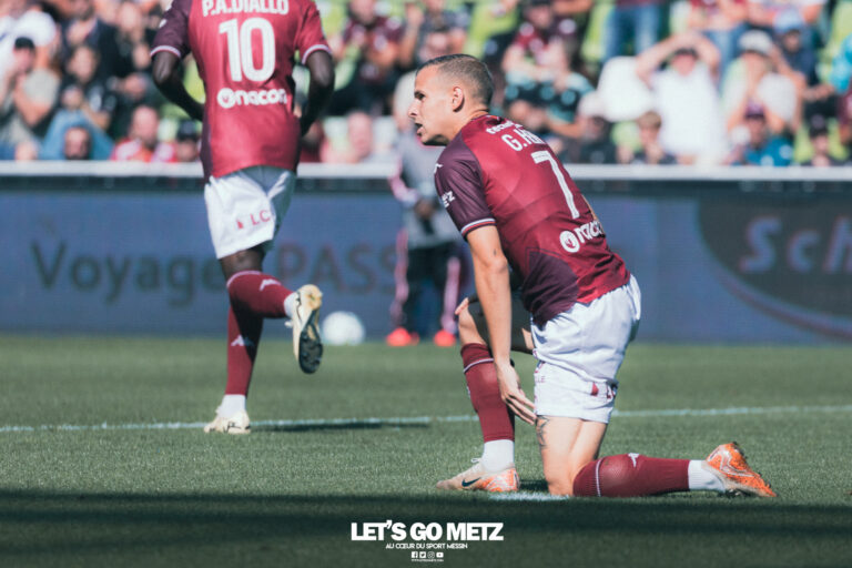 1,1K Le FC Metz s’est incliné sur la pelouse de l’ESTAC Troyes (2-1) pour le compte de la septième journée de Ligue 2 BKT. Les Grenats laissent leur place de leader au Paris FC. Après son large succès face au FC Martigues (6-0) le 24 septembre, le FC Metz se déplaçait dans l’Aube ce samedi pour y affronter la lanterne rouge l’ESTAC Troyes. Auteurs d’un début de saison catastrophique avec seulement un petit point en six matchs, les Troyens de Stéphane Dumont se devaient de relever la tête face à des Messins, quatrièmes au classement au coup d’envoi. Néanmoins, le milieu de terrain grenat Jessy Deminguet restait prudent avant la rencontre « Il faut être humble pour la suite du championnat ». De son côté, le coach troyen gardait espoir malgré l’entame de championnat plus que compliquée de sa formation « On continue à avancer malgré les difficultés et ça va être le mot d’ordre pour ce match ». Stéphane Le Mignan réitérait le même schéma tactique en 4-4-2 qui avait fonctionné à merveille quelques jours plus tôt face à Martigues. L’ancien tacticien de Concarneau apportait cependant quelques changements à sa défense, Traoré et Kouao remplaçaient respectivement Lo et Colin. Sous les yeux de Bernard Serin et d’un parcage visiteur bien rempli, les Lorrains étaient proches de concéder l’ouverture du score dès les premiers instants de la rencontre. En effet, Said était tout proche de donner l’avantage aux locaux d’une magnifique frappe du pied droit mais Oukidja se trouvait sur la trajectoire du ballon (1′). Après cette frayeur, Papa Diallo offrait la première véritable occasion aux Grenats avec une frappe enroulée mais la tentative du numéro 10 messin passait à quelques mètres de la cage de Boucher (11′). Au fil des minutes, les hommes de Le Mignan mettaient leur jeu en place et Elisor était tout proche de tromper le portier aubois de la tête (23′). Néanmoins à quelques minutes de la pause, l’ESTAC qui se trouvait dans un temps fort, ouvrait le score par l’intermédiaire de Papa Ibou Ba (1-0, 42′). Mi temps : 1-0 Des Grenats en manque d’inspiration Au retour des vestiaires, les Lorrains éprouvaient beaucoup de difficultés à faire le jeu face à une équipe troyenne bien en place. Les maigres occasions messines venaient principalement du côté droit avec Kouao ou sur un coup franc de Jallow (60′). Après l’heure de jeu, l’entraineur du FC Metz décidait de faire rentrer du sang neuf dans le secteur offensif avec les entrées d’Ibou Sané et de Benjamin Stambouli (68′). À l’entame du dernier quart d’heure, les visiteurs se procuraient un nouveau coup franc. Le tir de Hein est dévié par Irié mais la balle trouvait la tête de Traoré qui marquait de la tête (78′ 1-1). Les Grenats pensaient avoir fait le plus dur mais quelques secondes après l’engagement de l’ESTAC, Diop était déstabilisé dans la surface de réparation par Udol. L’arbitre de la rencontre, Antoine Valnet désignait sans hésiter le point de pénalty que transformait Ripart (2-1, 80′). Metz poussait en toute fin de rencontre pour revenir au score et arracher le point du nul mais ne parvenait à trouver la solution. Après 31 matchs sans défaites en Ligue 2 BKT, les Grenats s’inclinent pour la première fois. Le 5 octobre prochain, le FC Metz recevra Amiens au stade Saint-Symphorien. ESTAC Troyes 2-1 FC Metz Mi-temps : 1-0 . Buts pour l‘ESTAC Troyes : Pape Ibnou Ba (42e) et Renaud Ripart (80e) Buts pour le FC Metz: Ismaël Traoré (78e) ESTAC Troyes : Boucher – Gozzi, Monfray (Cap.), Diaz, Boura – Kanté, M’Changama (Adeline 33′), Diop – Said (Ripart 73′), Ba (Dong 73′), Irié (Chavalerin 90′)FC Metz : Oukidja – Udol (Cap.), Traoré (Lô, 83′), S. Sané, Kouao – Deminguet, Hein, Jallow, Diallo (I. Sané 68′) – Elisor (Stambouli 68′), Sabaly Enzo Perretta, à Troyes (Aube). Crédit photo : Julien Buret / Let’s Go Metz