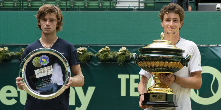 473 Vainqueur en finale face au Russe Andrey Rublev, Ugo Humbert a remporté au Noventi Open son premier titre en ATP 500, prouvant une bonne fois pour toute que son niveau de jeu actuel sur gazon est l’un des tout meilleurs. Il n’était pas allé au bout de l’aventure pour sa première sortie sur gazon à Stuttgart, éliminé par Félix Auger-Aliassime, mais il avait déjà montré les bases d’un jeu bien différent de ce qu’il avait esquissé sur terre battue lors de 6 défaites de rang. Aligné au tournoi de Halle avec l’ambition de développer un peu plus ses compétences avec à l’horizon le challenge de Wimbledon, Ugo Humbert a surement dépassé ses propres ambitions en remportant le trophée au terme d’une semaine de compétition particulièrement usante où il a dû notamment faire face à Alexander Zverev, numéro 6 mondial. Opposé en finale à Andrey Rublev, numéro 7 mondial, Ugo Humbert n’a pas fait honneur à sa réputation de marathonien de Halle en se montrant relativement expéditif. Profitant de la maladresse du Russe au service (50% de premiers services), le Français capitalisait sur sa première occasion de break pour prendre la tête à 4-3 avant de porter le coup de grâce, malgré deux balles de débreak concédées, sur le service suivant : 6/3Dans le second set, Andrey Rublev retrouvait ses esprits et proposait un jeu plus solide et puissant sur son service mais ne parvenait pas à inquiéter Ugo Humbert sur ses mises en jeu, conduisant le match vers un tie-break. Désormais diablement entraîné à l’exercice depuis son entrée sur gazon, le Français emportait les points nécessaires pour prendre l’avantage sur cette séquence décisive 7-4 et s’adjuger la victoire du match : 7/6. En battant Andrey Rublev, Ugo Humbert accroche à son tableau de chasse le scalp d’un deuxième joueur du top 10 sur le même tournoi. Il emporte également avec lui son tout premier trophée sur ATP 500 dans ce qui marque sa troisième victoire sur un tournoi en carrière, le tout sur une troisième finale. Resteront également en mémoire les performances impressionnantes du Messin qui vont lui permettre de conforter sa place au classement mondial et dans la hiérarchie Française. Et maintenant ? Déjà confirmé au tournoi de Majorque, Ugo Humbert reprendra la compétition dès ce Mardi en 16ème de finale dans un tournoi où il aura le statut de tête de série numéro 7, face au Serbe Miomir Kecmanoviç, 47ème joueur mondial. Cet ATP 250, dirigé par Toni Nadal devrait être le dernier tournoi du Français avant de s’attaquer au géant Wimbledon où il avait brillé en 2019 et où son nouveau statut de 25ème mondial, son meilleur classement en carrière, lui épargnerait une confrontation directe avec un joueur majeur jusqu’aux huitièmes de finale… Crédit photo : Noventi Open / Mathias Schulz