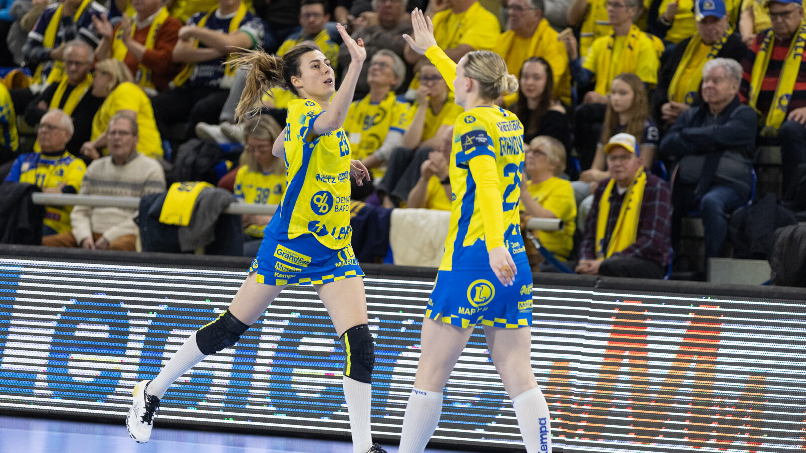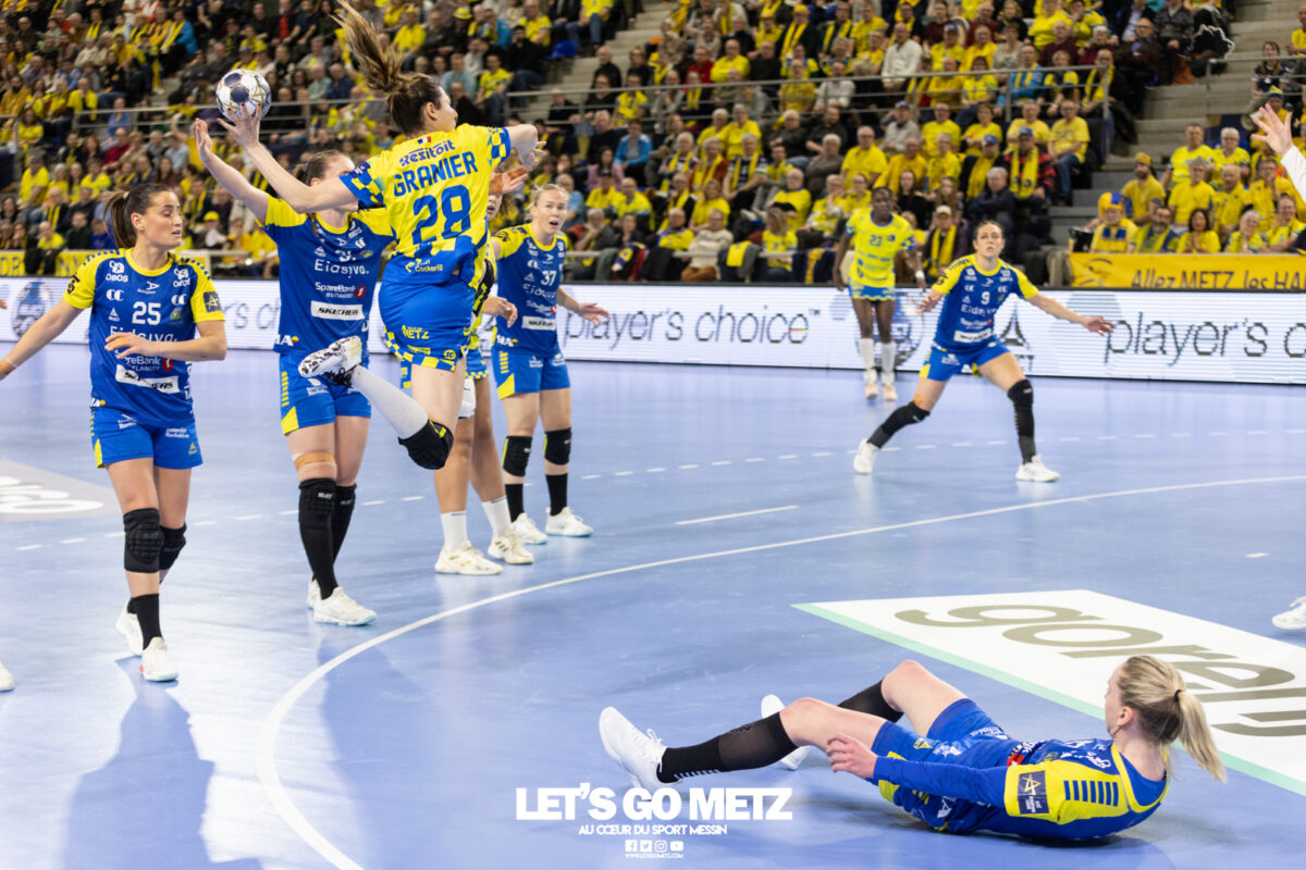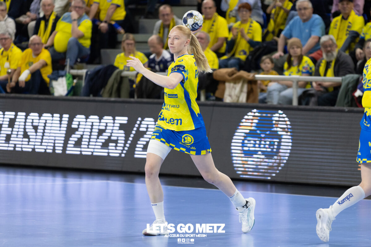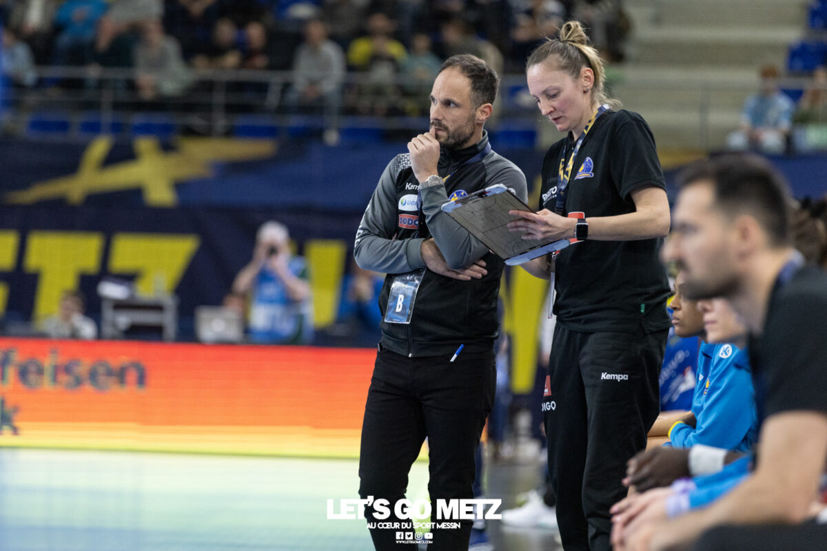 72 Après une semaine compliquée, Metz Handball renoue avec la victoire ce samedi face à Storhamar (29-27) mais les doutes demeurent. Cette rencontre face à Storhamar devait permettre à Metz Handball de repartir de l’avant et de retrouver la victoire. Si le succès est au bout et met fin à cette série de revers (face à Györ, puis à Brest), le contenu laisse les observateurs sur leur faim. Même s’il était attendu que les Norvégiennes seraient des adversaires coriaces, puisque c’est le cas à chaque fois qu’elles affrontent les Dragonnes, on aurait pu penser que les partenaires de Chloé Valentini aborderaient cette opposition de manière plus conquérante. Or il n’en fut rien tant il aura fallu attendre un long moment avant qu’elles ne prennent un ascendant définitif et s’assurent de la victoire. Les difficultés rencontrées face au champion d’Europe et le revers concédé face à son principal rival sur la scène nationale semblent être encore bien présents dans les têtes. Sarah Bouktit sauve les apparences mais Metz Handball voit ses leaders en difficulté Si Metz Handball a habitué ses suiveurs à commencer doucement ses matchs avant de porter un coup d’accélérateur souvent fatal à leurs adversaires, force est de constater qu’en ce début d’année, à l’exception de Dijon, il s’en trouve incapable. Si l’on pouvait expliquer les difficultés par le pédigrée des adversaires cette fois, face au sixième du groupe A de Ligue des champions, il était attendu que les filles prennent rapidement le match en main et les devants au tableau d’affichage. Pourtant, il a fallu attendre le quart d’heure de jeu pour voir les Jaune et Bleu mener après une réalisation de Petra Vamos (10-9, 16e). Avant? Les Dragonnes peinaient à freiner les velléités offensives scandinaves, notamment celles d’Annike Obaidli et d’Oda Mastad. Les Norvégiennes parvenaient même à prendre jusqu’à trois longueurs d’avance (5-8, 12e). Cet écart s’expliquait par une une défense moins rigoureuse devant une Johanna Bundsen moins inspirée qu’en Bretagne et, en attaque, par un manque de réussite ou de précision à l’image des poteaux touchés par Suzanne Wajoka. Lena Grandveau, placée arrière droite au coup d’envoi peinait à se montrer décisive dans les premières minutes avant de retrouver ses repères lors des entrées d’Ana Albek et Tyra Axnér (20e). Chloé Valentini et Sarah Bouktit, profitant de l’exclusion pour la seconde fois de Kjerstin Boge-Solas, donnaient l’avantage aux Lorraines en cette fin de premier acte (14-13, 24e). La pivot continuera à être influente dans les trente dernières minutes pour finir avec dix réalisations. Sabrina Novotna tient son match référence sous le maillot messin Mais l’entrée la plus impactante était celle de Sabrina Novotna à quelques encablures de la pause. La gardienne tchèque allait stopper un tir de Sanne Lokka Hagen peu de temps après et Metz Handball rejoignait les vestiaires avec un petit but d’avance (17-16, 30e). Une autre parade face à la capitaine adverse, Malin Aune, confirmait sa bonne dynamique. La gardienne internationale qui a peu l’occasion de s’exprimer, profitait de l’opportunité pour se montrer solide et réaliser sans aucun doute son meilleur match depuis son arrivée. Elle terminait la rencontre avec neuf parades et évitait à ses partenaires de subir une nouvelle déconvenue au cours de cette semaine compliquée. Car si Metz Handball parvenait à compter jusqu’à quatre buts d’avance après une réalisation de Tyra Axnér (24-20, 43e), ce pécule fondait rapidement sous l’impulsion de Véronika Mala, Malin Aune ou encore Élise Skinnehaugen et Mathilde Rivas-Toft (24-24, 48e). Les championnes de France parvenaient à prendre à nouveau leurs distances grâce à Sarah Bouktit, Suzanne Wajoka et Lucie Granier (28-24, 54e) et tenaient leur victoire (29-27) avec une dernière parade de Sabrina Novotna. Le groupe a désormais une semaine pour analyser ses dernières prestations et trouver comment gagner en constance et en fluidité des deux cotés du terrain avant de se rendre sur le parquet des Monténégrines de Buducnost Podgorica dimanche prochain (16 h). La galerie de la rencontre Les stats du match Metz HandballJohanna Bundsen (2 parades sur 15 tirs), Sabrina Novotna (9/23)Chloé Valentini (2 buts sur 3 tirs, capitaine), Tyra Axnér (2/4), Suzanne Wajoka (2/5), Anna Albek (2/4), Anne-Emmanuelle Augustine, Xenia Smits, Betchaïdelle Ngombele (2/5), Elea Ferdilus, Sarah Bouktit (10/14), Lucie Granier (5/8), Lena Grandveau (3/9), Petra Vamos (1/4), Lylou Borg, Clémence Castets.Exclusions: Ngombele (8e), Vamos (19e), Albek (51e) Storhamar Handball EliteJulie Victoria Nordevall (0 parade sur 1 tir), June Cécile Krogh ( 15/43 et 1 but sur 1 tir)Malin Larsen Aune (7 buts sur 7 tirs), Storbaek Ingeborg Monné (0/1), Mathilde Rivas-Toft (2/7), Élise Skinnehaugen (1/1), Nora Isabell Nordstrand (1/2), Anniken Obaidli (4/8), Ada Aalstad (0/2), Kjerstin Boge-Solas (5/10), Sanne Lokka Hagen (1/3), Oda Cathrine Lunne Mastad (5/7), Veronika Kafka Mala (2/3).Exclusions: Boge-Solas (24e, 30e), Mala (38e) Crédit photos: Matthieu Henkinet / Let’s Go Metz