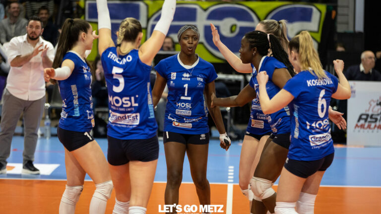 381 Le TFOC s’en sort en quatre sets face à Chamalières. Sans Greta Kiss et Alicia Ogoms, les Bleues ont poussé pour aller chercher les trois points. Le TFOC met la pression sur Le Cannet. Samedi soir, les Bleues se sont imposées, 3 sets à 1, face à Chamalières. Avec les trois points, les partenaires de Shannon Scully ont pris provisoirement la 5ème place, avant le match entre Le Cannet et le RC Cannes. « Nous avons été chercher une victoire difficile », s’est réjoui Romain Pitou après la rencontre. Une heure avant le coup d’envoi, l’entraîneur apprenait la blessure de Greta Kiss, bloquée au dos, conjuguée à celle d’Alicia Ogoms. Touchée à la cuisse, Majira Skoric était contrainte de tenir sa place. Malgré les pépins physiques, les Mosellanes rentraient bien dans leur rencontre (11-8). Sans être flamboyant, le TFOC prenait la première manche (25-21). Le TFOC porté par Mariam Sidibé Cette avance, les Bleues allaient la voir s’évaporer. Complétement dépassées en réception, les coéquipières de Kendall White laissaient l’adversaire prendre le large (13-16). Chamalières s’adjugeait logiquement le deuxième set (22-25). À égalité, Mariam Sidibé, auteure de 16 points, remettait son équipe dans le match (7-4). Sur une attaque en force, la capitaine du TFOC se chargeait de conclure la troisième manche (25-17). Portées par une Taylor Fricano tranchante, les Bleues signaient quatre points consécutifs (9-5). Chamalières était complètement dépassé (17-10). Mais Sabine Haewegene retrouvait de l’efficacité à l’attaque jusqu’à voir son équipe revenir à hauteur (22-22). Devant son public, le TFOC balayait finalement les espoirs adverses avec sa 17ème victoire de la saison (25-22). « Avec les trois points, nous passons 5ème, mais le plus important c’est d’éviter un tableau avec Mulhouse et Le Cannet », a jugé le technicien des Bleues. Avant son dernier match de la saison face à Saint-Raphaël dans deux semaines, le TFOC espère retrouver toutes ses forces. « Alicia Ogoms pourrait revenir pour la dernière journée », a confié Romain Pitou. Avec la centrale Canadienne, Terville Florange retrouverait une équipe complète juste avant les play-offs. TFOC Volley 3 – 1 Chamalières Sets : 25-21, 22-25, 25-17, 25-22. Composition TFOC : Dia, Skoric, Kosekova, Sidibé (C), Scully, Fricano, White (L). Composition Chamalières : Aguilera, Diouf, Bah, Elouga, Haewegene, Guncheva, Bernard (L). Crédit photo : Julien Buret (archive).