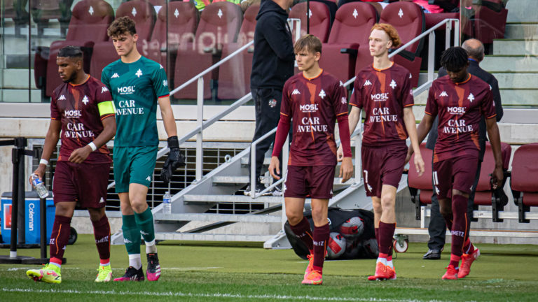 499 Auteurs d’une première mi-temps encourageante contre le FC Fleury 91, la réserve du FC Metz s’est fait cueillir au retour des vestiaires et n’a pas trouvé la force nécessaire pour recoller. Les jeunes grenats se sont inclinés 3-1 à Saint-Symphorien, malgré l’aide d’Opa Nguette, qui effectuait son retour à la compétition. Face à un adversaire ayant réalisé un début de championnat parfait avec trois victoires en autant de matchs, la réserve messine s’attendait à une partie difficile. D’autant que Frédéric Antonetti avait retenu certains cadres comme Ba, Lacroix et Mbengue dans le groupe professionnel. Seul Opa Nguette venait renforcer l’équipe, mais le Sénégalais, de retour à la compétition après de longs mois d’absence, ne devait disputer qu’une mi-temps pour retrouver progressivement du rythme. Le premier acte était pourtant d’assez bonne facture pour les joueurs de Stéphane Saillant, dans une véritable opposition de styles : à la puissance et au jeu direct des Franciliens, les locaux répondaient par une vivacité, une technique et un jeu de passes supérieurs. Malgré cela, les occasions restaient rares, des tirs de Daoud (5e), Raillot (33e) et Zilliox (39e) n’apportant au mieux que des corners, et une tête mal ajustée de Daoud (38e) passant de peu au-dessus de la barre. Le plus beau geste de la mi-temps était d’ailleurs l’œuvre d’un défenseur : sur une longue balle en profondeur vers un attaquant de Fleury, Albenas sprintait vers son but et réalisait une merveille de contrôle en pleine course, que la tribune Nord applaudissait chaleureusement. Des erreurs de jeunesse fatales pour la réserve du FC Metz Les Grenats pouvaient légitimement se montrer ambitieux au retour des vestiaires, mais ils manquaient de vigilance à la reprise du jeu et se trouvaient immédiatement menés sur une frappe puissante de Mangonzo (0-1, 47e). Ils perdaient pied ensuite, à l’image de Zilliox qui, sur une passe en cloche ne présentant pas de véritable danger, manquait le ballon et déséquilibrait son attaquant dans la surface (64e).Heureusement, au prix d’un bel arrêt en deux temps, le jeune Alexis Mirbach maintenait ses équipiers dans le match. Ce n’était que partie remise pour Fleury : sur une passe en profondeur anodine, une mésentente dans l’arrière-garde messine permettait à Cucu de toucher le ballon, que Mirbach semblait pourtant avoir en mains, et de le pousser dans le but vide (0-2, 67e). L’addition devenait même particulièrement salée après un nouveau pénalty, beaucoup moins évident que le premier, et transformé par Sylla (0-3, 78e). En perte de confiance, les Grenats tentaient de réagir, mais Fernandes manquait de précision aussi bien du pied (62e) que de la tête (74e, 80e). Ali Saïd, entré à la mi-temps à la place d’un Nguette très peu en vue, dynamisait également l’attaque messine et décochait une belle frappe de loin captée difficilement par Petit (85e). La dernière occasion se présentait dans les arrêts de jeu : après un violent tacle par derrière sur Daoud, seulement sanctionné d’un carton jaune par M. Cardon, Jungling frappait le coup franc vers le but et une tête adverse en prolongeait la trajectoire jusqu’au fond des filets (1-3, 93e). Ce but pour l’honneur ne changeait rien au résultat final. Crédit photo : Lucas Deslangles