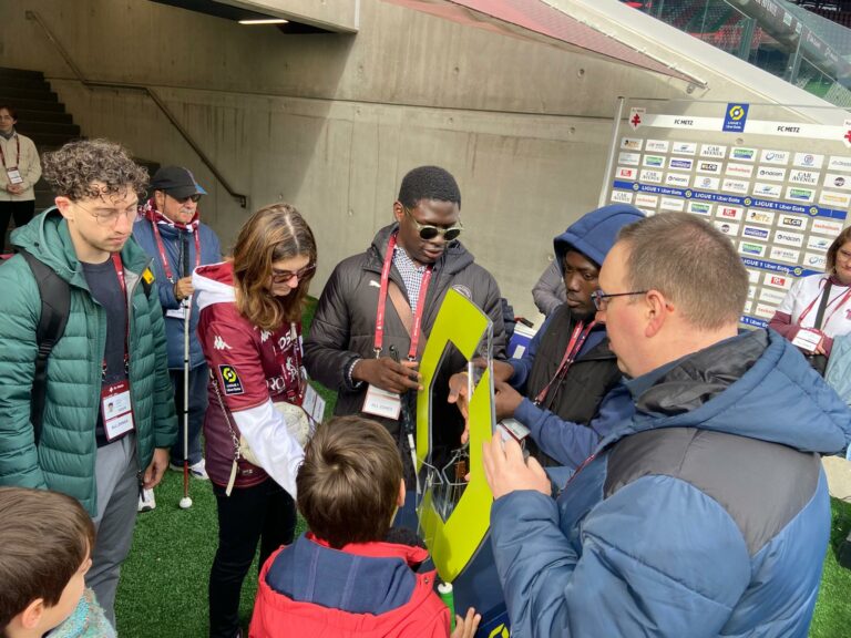 1,4K En amont de la rencontre Metz-Lille, un groupe de malvoyants a été invité à visiter le stade Saint-Symphorien. Le partenariat entre l’association UniversJo et le club mosellan a permis cette opération. Un pas en avant dans l’inclusion des personnes déficientes visuelles. Les pieds sur la pelouse messine. C’est l’avant-match que les membres de UniversJo ont pu vivre avant la rencontre Metz-Lille. Depuis maintenant deux saisons, l’association propose les prestations du FC Metz en audiodescription. Le moyen d’intégrer les personnes malvoyantes dans l’antre de Saint Symphorien. « Un partenariat, c’est donnant-donnant. On est là pour accueillir ces personnes au mieux, et bien entendu, mettre en valeur ce que fait le FC Metz pour ces supporters-là » clame Olivier Lallement, le président de l’association, pour expliquer cette collaboration. Une action saluée par les personnes déficientes visuelles. « C’est important d’avoir ce genre de rendez-vous, cela nous permet de découvrir des choses que l’on entend souvent, mais que l’on ne perçoit pas » décrit Malick, joueur de Cécifoot et membre l’organisation. Cette initiative est née d’une discussion entre le fondateur d’UniversJo et son fils, Joachim, atteint du Syndrome du Morsier depuis la naissance. « En échangeant avec lui, je me suis rendu compte qu’il n’avait pas du tout la notion des distances. Le but étant avant tout de voir comment cela se passait, et c’est pour cela que l’on a proposé cette visite du terrain » explique le père de famille impliqué. Au gré des réunions avec la structure grenat, la sortie envisagée devient réalité « Je remercie le FC Metz de nous avoir permis cela. On a eu vingt-cinq personnes conviées à parcourir le terrain » se félicite Olivier Lallement, entouré de ses deux fils jumeaux. Un tour d’honneur Pour démarrer cette journée, les participants sont conviés à découvrir le chemin emprunté par les joueurs. Le groupe est emmené par Maxime, employé de la structure grenat. La trentaine de visiteurs se rejoint en zone mixte. Quatre heures avant le coup d’envoi, l’agitation autour d’eux se fait ressentir. Les derniers préparatifs du début d’après-midi se déroulent devant eux. « Les équipes de télévision s’installent bien avant le début du match. Sur ce genre d’affiche, ils sont réquisitionnés à H-5, voire H-6 pour les plus importantes » explique Maxime en rentrant sur le terrain. Initialement au programme, le tour des vestiaires n’a pas été possible dû à la présence matinale du sportif. « On va essayer de repenser une autre visite, en dehors de jour de match. On sent que c’est tendu, ça court partout. Nous avons essayé, car tout le monde était là pour la rencontre qui suivait, mais je pense que ce n’était pas le meilleur moment pour le faire, pour des personnes malvoyantes ». S’ensuit un tour de stade au milieu d’une enceinte vide. Un moment hors du temps où toucher la pelouse éveille les sensations. Un moment de solidarité autour de ce groupe, comme quand quatre bénévoles de l’association UniversJo aident une personne en fauteuil roulant à gravir les marches du tunnel des joueurs. Les membres de l’association UniversJo réunis derrière la cage messine « 850 heures de bénévolat » Toujours présent aux côtés des membres, les bénévoles ont aussi pu profiter de la matinée. Mélange d’étudiants audio descripteurs et de volontaires responsabilisés, cette opportunité témoigne de la gratitude du club envers ces personnes dévoués. « Le club reconnaît le travail que l’on fait. On a passé plus de 850 heures de bénévolat aujourd’hui rien que pour le FC Metz » raconte Olivier Lallement, fier du travail accompli. Déjà bien implantée à Saint-Symphorien, l’équipe d’audiodescription d’UniversJo prospecte de nouveaux horizons, stades ou disciplines. Après des déplacements déjà planifiés à Auxerre ou Strasbourg, ils ont eu l’honneur d’être au micro lors de la rencontre de football féminin entre l’Équipe de France et l’Irlande. « On a eu la Fédération Française de Football qui nous a fait un retour sur cette rencontre. Ils nous ont dit que l’on était l’une des meilleures équipes d’audiodescription en France ». L’équipe d’audiodescription assure les commentaires depuis maintenant 2 ans Malgré l’imbroglio autour de la salle initialement accordée à cette cause, mais qui sert maintenant de salle sensorielle pour les personnes atteintes de troubles autistiques, le staff d’UniversJo a rempli sa mission. Ils assurent leurs commentaires pour que les personnes équipées vivent un match comme n’importe quel autre supporter. Même si leurs joueurs fétiches se sont inclinés ce week-end, la vraie victoire, elle est ici. Crédit photo : Facebook association UniversJo