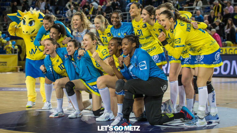 2,9K Le Metz Handball s’est imposé sur le parquet de Brest (19-24), ce mercredi. Les Dragonnes effacent ainsi le revers du match aller et prennent un avantage certain dans la course au titre en Ligue Butagaz Energie. Après Bucarest, avant Budapest, les Messines ont encore du pain sur la planche sur le plan national. À peine débarrassées des confettis de la qualification au Final 4, les joueuses du Metz Handball abordaient un des matchs les plus importants de leur saison, ce 8 mai à Brest. Défaites au match aller d’un unique but, les Dragonnes se devaient de renverser leurs rivales bretonnes sur leurs terres pour s’aligner à nouveau avec la probabilité d’un triplé historique en fin de saison. C’est chose faite. Brest a joué son va-tout Mal entrées dans la partie en raison de parades de Filter, de missiles signés Maslova mais aussi de trop nombreuses maladresses, les Messines se reprenaient grâce à une contre attaque conclue par Chloé Valentini et un but rageur d’Anne Mette Hansen (3-3, 9ème). Elles prenaient même le contrôle du score via un tir de Louise Burgaard sur l’action suivante, au grand dam des 4285 spectateurs de l’Arena. La rencontre n’en était pas moins disputée dans les minutes suivantes. En jeu, le choc de deux stratégies. Une alternance Djazz Chambertin / Anne Mette Hansen autour d’une défense avancée et mobile côté messin. La volonté de bloquer le jeu rapide et de produire des tirs avantageux depuis l’arrière pour Brest. À ce jeu, Brest prenait l’avantage et forçait Emmanuel Mayonnade à prendre un temps mort (7-5, 14ème). La stratégie bretonne s’ajustait elle aussi avec plus de jeu vers l’extérieur et Lucie Granier en faisait les frais avec la première suspension de la partie (9-6, 17ème). Une des réponses choisies par Emmanuel Mayonnade pour survenir aux maux du début de match, Alina Grijseels quittait le terrain prématurément sur carton rouge après un tir dans la tête de Katharina Filter sur un jet de sept mètres. Pourtant, les Messines gardaient la tête froide et parvenaient à recoller, notamment grâce à la lutte acharnée de Sarah Bouktit au pivot (9-8, 25ème). C’est finalement un lob savoureux de Chloé Valentini, au bout d’un mouvement collectif, qui remettait les deux équipes à niveau, à moins d’une minute de la mi-temps. Un quasi-miracle compte tenu du vent contraire.Score à la mi-temps : 11 – 11 Un arbitrage trouble qui n’a pas perturbé Metz Handball Le début du second acte voyait l’entrée en jeu d’Emma Jacques, particulièrement efficace lors du match de Coupe de france dans la même salle quelques semaines auparavant. Cependant, un nouveau tir de Maslova et une suspension pour deux minutes de Sarah Bouktit replongeaient Metz Handball dans la difficulté… Mais c’était sans compter sur les individualités messines : un arrêt sur penalty par Hatadou Sako, un déclenchement d’Emma Jacques et un éclair de Chloé Valentini gardaient le Metz Handball en tête (12-13, 35ème). La dynamique restait messine au fil des minutes, si bien qu’après 16 minutes dans le second acte, les Dragonnes comptaient quatre unités d’avance (14-18, 46ème). À défaut de satisfaire les supporters des deux camps, le duo arbitral réussissait la performance de rétablir l’équité via le nombre d’erreurs commises de part et d’autres. Pieds, passages en force, défense en zone sifflées aléatoirement… Les joueuses des deux équipes composaient alors avec un manque de logique arbitral handicapant pour un match à ce niveau d’enjeu. À cinq minutes du coup de sifflet final et alors que l’ambiance de la Brest Arena montait d’un cran, les Dragonnes comptaient toujours trois buts d’avance (18-21). Kristina Jorgensen et Chloé Valentini, encore précieuses ce mercredi, parachevaient le succès messin (18-23, 59ème). Une victoire capitale pour les Dragonnes.Score final de ce Brest – Metz Handball : 19-24 « C’est vrai qu’en début de match on avait beaucoup de pression à cause du match aller. Depuis ce jour, on a promis de se battre pour aller gagner à Brest, et montrer que le titre n’allait pas se jouer sur le penalty de Kristina. On a réussi à se mettre un coup de boost en deuxième mi-temps, moi y compris, et cela a fait la différence. Cette victoire s’est construite grâce à une grosse défense, mes arrêts sont la conséquence de l’agressivité des filles devant », savourait Hatadou Sako au micro de BeIN Sports. Après avoir passé l’obstacle Brest, Metz Handball a désormais un boulevard vers le titre de champion de France. Mais ça, il faudra le confirmer sur les parquets de Ligue Butagaz Energie… Crédit photo : Matthieu Henkinet / Let’s Go Metz (archives)