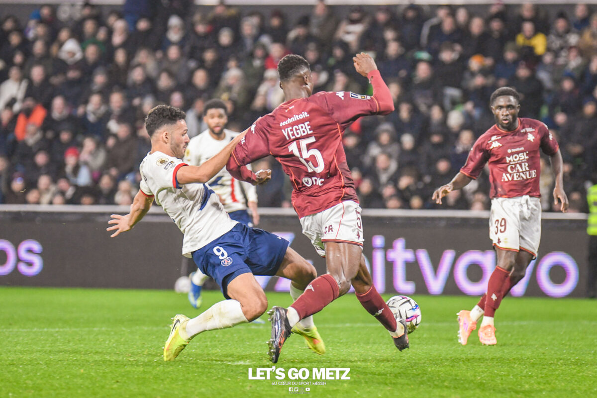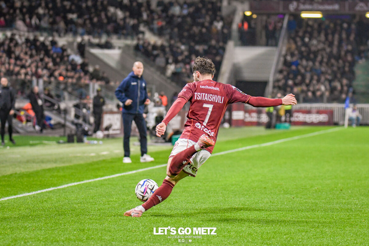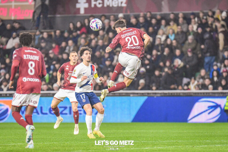 58 Loin d’être ridicule, le FC Metz n’a pas réussi à faire déjouer le PSG ce samedi 13 décembre 2025 (2-3). Les Grenats auront toutefois eu le mérite de montrer qu’il faudra compter jusqu’au bout sur cette équipe, peu importe l’adversité. On ne s’attendait pas à un miracle. Du moins, s’attendait-on peut-être au pire, alors que la lanterne rouge messine, défaite il y a une semaine à Auxerre, affrontait une équipe qui venait de passer comme un rouleau compresseur sur le Stade Rennais dans son antre du Parc des Princes (victoire 5-0). Devant son public, le FC Metz a finalement livré une prestation plus qu’honorable. Une copie qui montre sa capacité à se mettre au niveau de la Ligue 1 mais aussi ses limites, payées cash, à l’image de ce but de Désiré Doué, remontant le camp messin tout seul, sans opposition… en plein temps fort des Grenats (1-3, 63′). Un fait de jeu symptomatique, qui pourra nourrir à lui seul tous les regrets des Mosellans. « On s’est laissés aspirer parce que pendant quelques minutes, on est en situation favorable […] et on oublie qu’il faut se discipliner, parce qu’à ce niveau-là, ça ne pardonne pas », s’attriste Stéphane Le Mignan. Photo : Mikael Frank/LGM. Et pour cause, la bande à Gauthier Hein aurait eu mieux à tirer de ce match, faisant mieux que résister aux Parisiens. Jusqu’à renverser la tendance en deuxième mi-temps, de l’aveu même de Luis Enrique ! L’entraîneur du PSG s’est fait « peur, très peur », en fin de match : « Le FC Metz a très bien joué. On a perdu l’équilibre et le contrôle dans la deuxième partie de la seconde mi-temps », avoue en conférence de presse le technicien espagnol. « Ils ont la capacité de ressortir le ballon de derrière », chose « pas facile pour les équipes du bas du classement », s’épate le coach, en référence au plan de jeu messin perpétué contre vents et marées malgré son succès comptable mesuré. Le déclencheur Tsitaishvili Un état d’esprit positif incarné par Giorgi Tsitaishvili, qui a une nouvelle fois montré toute l’étendue de son talent sur le terrain. Le feu follet géorgien a gagné nombre de duels face à Warren Zaire-Emery – latéral droit en l’absence d’Achraf Hakimi – à qui il a fait vivre un vrai cauchemar. Des efforts récompensés par la création d’un danger permanent dans le camp parisien et – surtout ! – un but magnifique après une combinaison de haut vol avec Gauthier Hein et une frappe hors de portée de Matveï Safonov, dans son petit filet droit (3-2, 81′). Photo : Mikael Frank/LGM. « ll a été déterminant, a apporté beaucoup de bon sens, confirme Stéphane Le Mignan. Il n’y a pas qu’un super but, c’est une grande prestation de sa part. », développe le coach, qui salue sa « très bonne » association avec Maxime Colin. « On savait que [le côté droit] pouvait être une zone de jeu vulnérable de la part de Paris. On a profité pleinement de cela. » Globalement, c’est l’ensemble du bloc messin qui s’est démarqué par sa combativité. Les nombreuses occasions d’Habib Diallo, dangereux malgré le peu de ballons négociables à sa portée (35′, 60’…), l’ogive de Jessy Deminguet qui a fracassé le but et permis aux Grenats de se remettre à l’endroit alors que Paris venait de faire le break (1-2, 42′) et les interventions bien senties de Jean-Philippe Gbamin ont rendu la copie plus qu’intéressante. « Le comportement des joueurs a été très bon, abonde l’entraîneur messin. Il faut garder beaucoup de cela pour la deuxième partie de saison qui va être longue. » « Il y a matière à faire encore mieux » Garder beaucoup, mais élaguer, aussi. Car si les Messins repartent une nouvelle fois bredouilles malgré leur honorable prestation, c’est également la faute à des moments d’hésitation, de manquements. Une nouvelle fois, le FC Metz a encaissé trois buts, après avoir subi le même tarif à Auxerre et essuyé un peu plus sévère contre Brest. « Il y a matière à faire encore mieux. On ne peut pas continuer sur le même rythme sur la deuxième partie de saison, acquiesce Stéphane Le Mignan. Il faut qu’on arrive à résoudre ces problèmes », assure-t-il, sans en donner la clé à ce stade. Avec 37 buts pris en 16 matchs, le FC Metz est l’équipe qui encaisse le plus, loin derrière le Paris FC (29 buts). Photo : Mikael Frank/LGM. Lanterne rouge en cette fin d’année 2025, mais pas largué au classement. Intéressant dans le contenu, sans répercussion comptable positive, les Grenats ont tout de même une trame sur laquelle travailler afin de repartir dans de meilleures conditions début 2026. « Il faut trouver une stabilité de jeu pour qu’il y ait des repères. Je trouve qu’il y a une base qui est assez stable au niveau du jeu depuis quelques temps », estime Stéphane Le Mignan. Dans la situation messine, c’est déjà ça. FC Metz 2 – 3 Paris Saint-Germain FC Metz : Fischer – Kouao, Gbamin, Yegbe (S. Sané, 74′), Colin – Deminguet (Stambouli, 84′), Traoré (Touré, 84′) – Mbaye (Sabaly, 84′), Hein, Tsitaishvili (Abuashvili, 84′) – Diallo. PSG : Safonov – Zaïre-Emery, Zabarnyi, Pacho, Hernandez – Ndjantou (Kvaratskhelia, 65′), Vitinha, Ruiz (Doué, 45′) – Lee, Ramos (Barcola, 65′), Mbaye. Buts : Ramos (31′), Ndjantou (39′), Deminguet (42′), Doué (64′), Tsitaishvili (81′) Avertissements : Zaïre-Emery (76′), Kouao (90+’). Arbitre : Romain Lissorgue. Photos : Mikael Frank/LGM.
