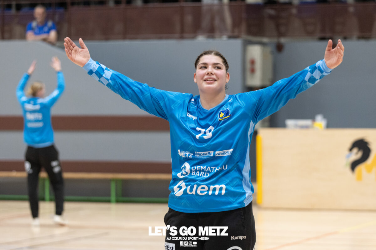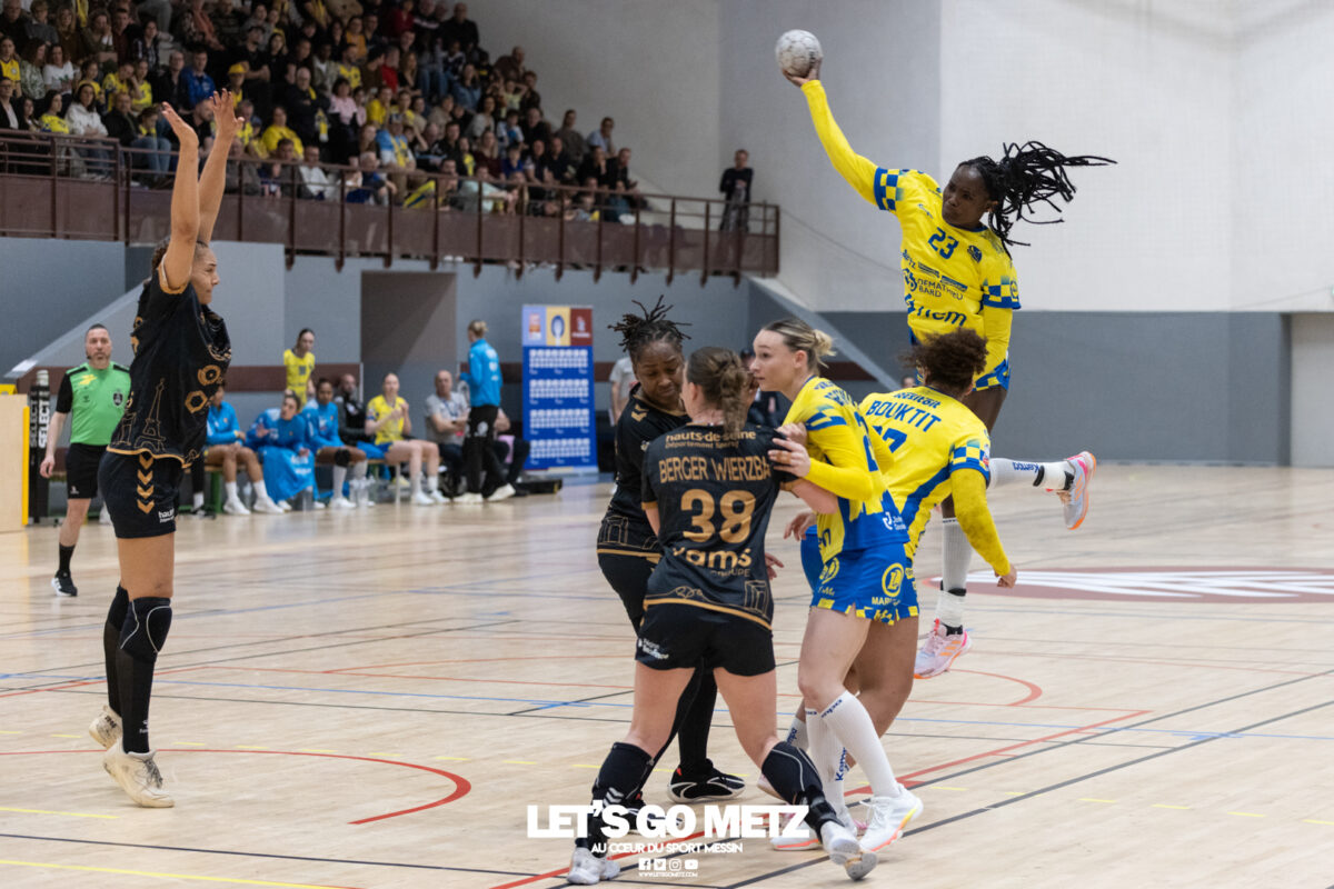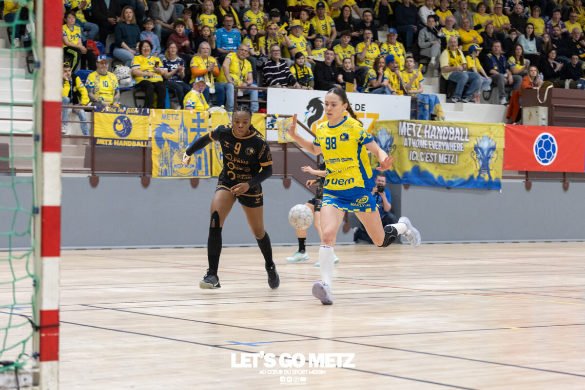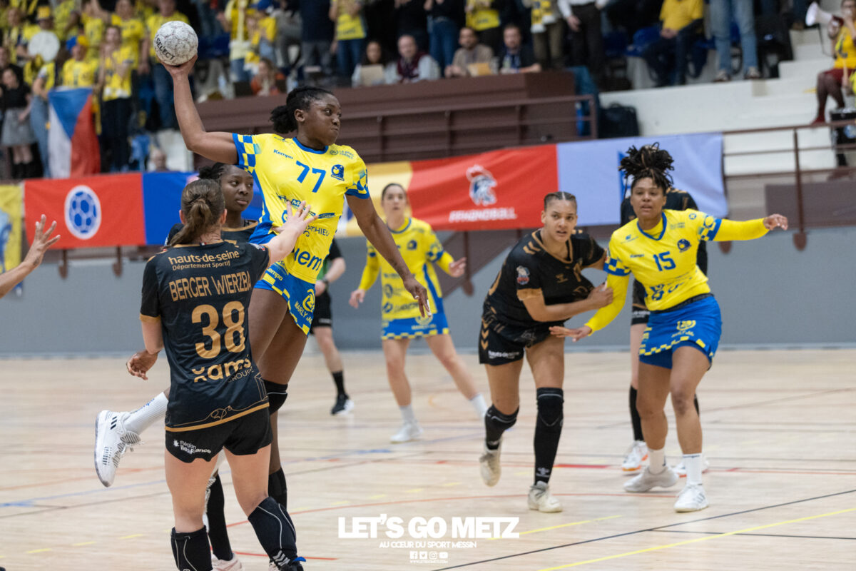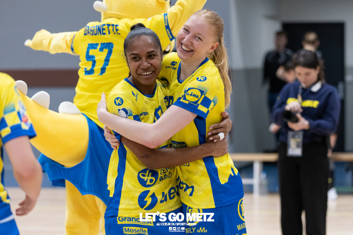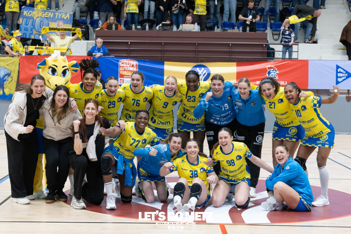 226 Ce samedi, Metz Handball s’est imposé face à Paris 92 et disputera sa cinquième finale de Coupe de France consécutive le 24 mai prochain. Après avoir battu son grand rival brestois fin février en quarts de finale, Metz Handball est devenu le grand favori à sa succession. Statut parfaitement assumé par les Dragonnes qui n’ont laissé aucun espoir à Paris 92 en s’imposant de dix-huit buts. Une victoire qui permet au club lorrain de rejoindre l’Accor Arena et y disputer sa cinquième finale de rang en Coupe de France. Si face à Nice mercredi, les partenaires de Chloé Valentini avaient rendu une copie moyenne dans le jeu, cette fois, elles se sont montrées impitoyables des deux cotés du terrain pour des Parisiennes sans solutions, davantage encore que lors des deux confrontations en championnat. Tyra Axner a fait parler son bras Paris 92 a bien mené au score dans cette rencontre grâce à un but de leur meilleure réalisatrice en Ligue Butagaz Energie, Coura Kanouté. Mais, avec la prestation de l’arrière Mathilde Plotton, ce seront sans doute les seuls motifs de satisfaction des filles de Naïm Sarni tant Metz Handball se muait en rouleau compresseur tout au long de cette demi-finale. Tyra Axner, Manon Errard, Sarah Bouktit et Grâce Zaadi créaient d’entrée un écart de trois unités (4-1, 6e). Suzanne Wajoka y allait même de son doublé après une réduction du score par la capitaine des Lionnes, Barbara Moretto (6-2, 8e). Tout semblait aller pour le mieux dans le meilleur des monde pour les Jaune et Bleu mais deux buts encaissés consécutivement agaçaient Emmanuel Mayonnade qui posait un temps mort. Une mise au point rapide mais qui lançait définitivement le TGV lorrain. En effet, bien que Marie Prouvensier et Mathilde Plotton parvenaient à tromper la vigilance de Johanna Bundsen, la gardienne suédoise se montrait solide dans ses cages (11 arrêts à 50%). Cette solidité, conjuguée à la précision de Tyra Axner, Lucie Granier, Petra Vamos et Sarah Bouktit, offrait un pécule de huit buts d’avance aux Messines à la pause (19-11, 30e). Sarah Bouktit une nouvelle fois irrésistible La pivot internationale, auteure de trois buts au cours de cette première moitié de match, ne comptait pas s’arrêter en si bon chemin. C’est elle qui ouvrait les hostilités du second acte avant de donner du spectacle en enchainant les combinaisons en contre attaque avec Chloé Valentini, notamment, et en se montrant implacable au jet de sept mètres. La future joueuse de Gyôr inscrivait finalement dix buts permettant à l’écart de gonfler inexorablement. Celui-ci atteignait les vingt buts (38-18, 55e) après que Grâce Zaadi ne trouve à nouveau le chemin des filets de Paris 92. Au relais de Tyra Axner, Betchaidelle Ngombele était également une grande artisane de ce festival offensif pendant que Sabrina Novotna restait dans la lignée de sa binôme avec neuf parades. Metz Handball s’imposait finalement de dix-huit buts (41-23) et se rapprochait d’un nouveau trophée avec cette finale de Coupe de France qui se profile le 24 mai prochain à 17 h 45. Les Dragonnes seront opposées à Dijon qui a éliminé Chambray ce samedi (31-25). Lylou Borg et Manon Errard peuvent désormais partir rejoindre l’équipe de France avec sérénité pendant que les autres internationales tricolores resteront cette fois à disposition de leur coach et commenceront à préparer la double confrontation qui les attend face au FTC Budapest, les 19 et 25 avril 2026 en quarts de finale de Champions League. La galerie de la rencontre Statistiques du match Metz HandballBundsen (11 parades sur 22 tirs), Novotna (9/21)Valentini (3 buts sur 3 tirs), Axnér (5/6), Wajoka (2/2), Anne-Emmanuelle Augustine (1/1), Ngombele (4/5), Bouktit (10/11), Granier (5/5), Grandveau (1/1), Vamos (3/5), Borg (1/1), Zaadi (3/3), Errard (3/4).Exclusions : Grandveau (3e), Errard (55e) Paris 92Foggea (3 parades/35 tirs), Kabeya-Tshisola (1/10)Nooitmeer, Golvet (0 but sur 4 tirs), Kanouté (5/10), Blonbou (0/2), Plotton (8/11), Moretto (1/5), Thudot, Hansson (1/3), Maurin (1/2), Wierzba (4/8), Thobor (1/2), Prouvensier (2/4)Exclusion : Golvet (23e) Crédits photos: Matthieu Henkinet / Let’s Go Metz