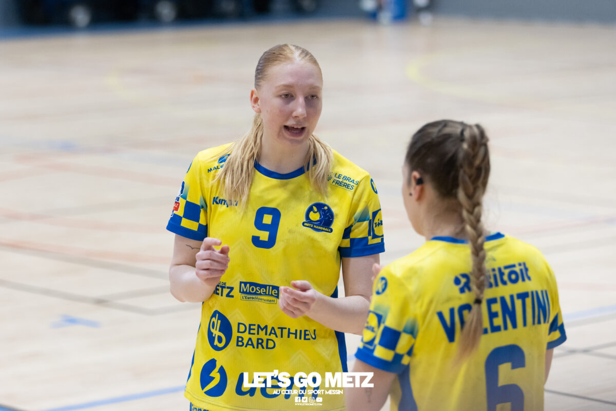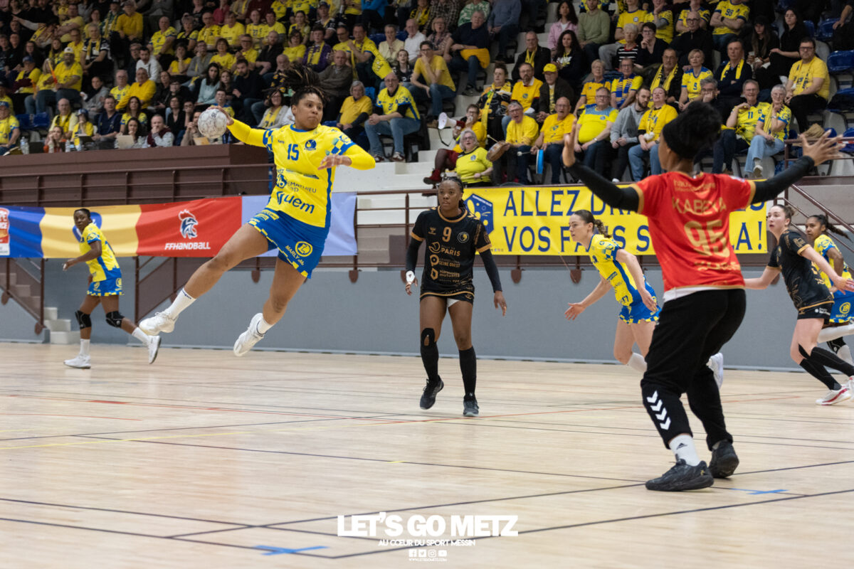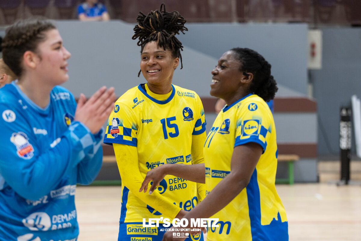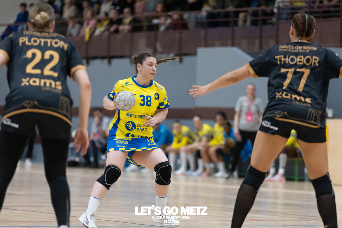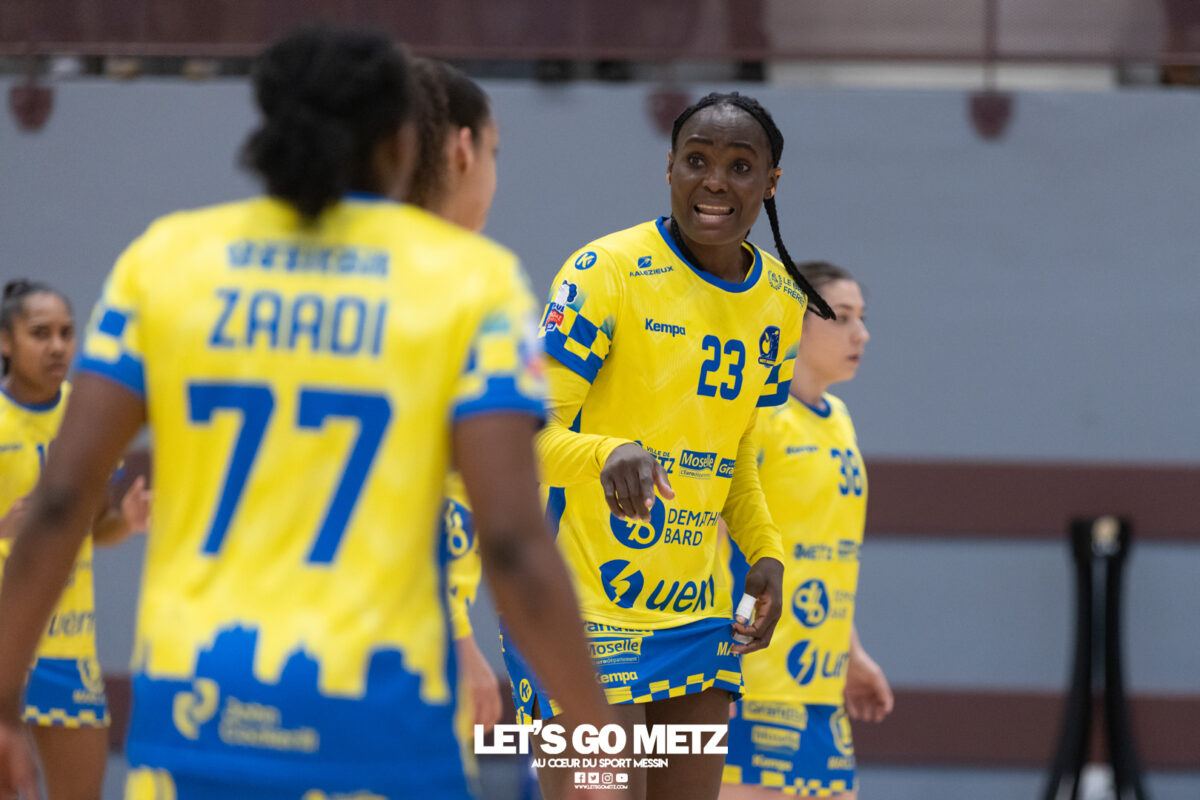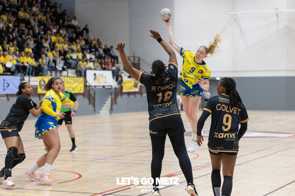 226 Ce samedi, Metz Handball s’est imposé face à Paris 92 et disputera sa cinquième finale de Coupe de France consécutive le 24 mai prochain. Après avoir battu son grand rival brestois fin février en quarts de finale, Metz Handball est devenu le grand favori à sa succession. Statut parfaitement assumé par les Dragonnes qui n’ont laissé aucun espoir à Paris 92 en s’imposant de dix-huit buts. Une victoire qui permet au club lorrain de rejoindre l’Accor Arena et y disputer sa cinquième finale de rang en Coupe de France. Si face à Nice mercredi, les partenaires de Chloé Valentini avaient rendu une copie moyenne dans le jeu, cette fois, elles se sont montrées impitoyables des deux cotés du terrain pour des Parisiennes sans solutions, davantage encore que lors des deux confrontations en championnat. Tyra Axner a fait parler son bras Paris 92 a bien mené au score dans cette rencontre grâce à un but de leur meilleure réalisatrice en Ligue Butagaz Energie, Coura Kanouté. Mais, avec la prestation de l’arrière Mathilde Plotton, ce seront sans doute les seuls motifs de satisfaction des filles de Naïm Sarni tant Metz Handball se muait en rouleau compresseur tout au long de cette demi-finale. Tyra Axner, Manon Errard, Sarah Bouktit et Grâce Zaadi créaient d’entrée un écart de trois unités (4-1, 6e). Suzanne Wajoka y allait même de son doublé après une réduction du score par la capitaine des Lionnes, Barbara Moretto (6-2, 8e). Tout semblait aller pour le mieux dans le meilleur des monde pour les Jaune et Bleu mais deux buts encaissés consécutivement agaçaient Emmanuel Mayonnade qui posait un temps mort. Une mise au point rapide mais qui lançait définitivement le TGV lorrain. En effet, bien que Marie Prouvensier et Mathilde Plotton parvenaient à tromper la vigilance de Johanna Bundsen, la gardienne suédoise se montrait solide dans ses cages (11 arrêts à 50%). Cette solidité, conjuguée à la précision de Tyra Axner, Lucie Granier, Petra Vamos et Sarah Bouktit, offrait un pécule de huit buts d’avance aux Messines à la pause (19-11, 30e). Sarah Bouktit une nouvelle fois irrésistible La pivot internationale, auteure de trois buts au cours de cette première moitié de match, ne comptait pas s’arrêter en si bon chemin. C’est elle qui ouvrait les hostilités du second acte avant de donner du spectacle en enchainant les combinaisons en contre attaque avec Chloé Valentini, notamment, et en se montrant implacable au jet de sept mètres. La future joueuse de Gyôr inscrivait finalement dix buts permettant à l’écart de gonfler inexorablement. Celui-ci atteignait les vingt buts (38-18, 55e) après que Grâce Zaadi ne trouve à nouveau le chemin des filets de Paris 92. Au relais de Tyra Axner, Betchaidelle Ngombele était également une grande artisane de ce festival offensif pendant que Sabrina Novotna restait dans la lignée de sa binôme avec neuf parades. Metz Handball s’imposait finalement de dix-huit buts (41-23) et se rapprochait d’un nouveau trophée avec cette finale de Coupe de France qui se profile le 24 mai prochain à 17 h 45. Les Dragonnes seront opposées à Dijon qui a éliminé Chambray ce samedi (31-25). Lylou Borg et Manon Errard peuvent désormais partir rejoindre l’équipe de France avec sérénité pendant que les autres internationales tricolores resteront cette fois à disposition de leur coach et commenceront à préparer la double confrontation qui les attend face au FTC Budapest, les 19 et 25 avril 2026 en quarts de finale de Champions League. La galerie de la rencontre Statistiques du match Metz HandballBundsen (11 parades sur 22 tirs), Novotna (9/21)Valentini (3 buts sur 3 tirs), Axnér (5/6), Wajoka (2/2), Anne-Emmanuelle Augustine (1/1), Ngombele (4/5), Bouktit (10/11), Granier (5/5), Grandveau (1/1), Vamos (3/5), Borg (1/1), Zaadi (3/3), Errard (3/4).Exclusions : Grandveau (3e), Errard (55e) Paris 92Foggea (3 parades/35 tirs), Kabeya-Tshisola (1/10)Nooitmeer, Golvet (0 but sur 4 tirs), Kanouté (5/10), Blonbou (0/2), Plotton (8/11), Moretto (1/5), Thudot, Hansson (1/3), Maurin (1/2), Wierzba (4/8), Thobor (1/2), Prouvensier (2/4)Exclusion : Golvet (23e) Crédits photos: Matthieu Henkinet / Let’s Go Metz
