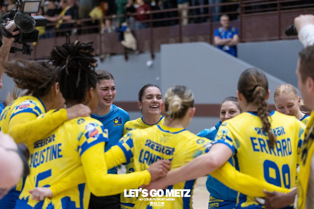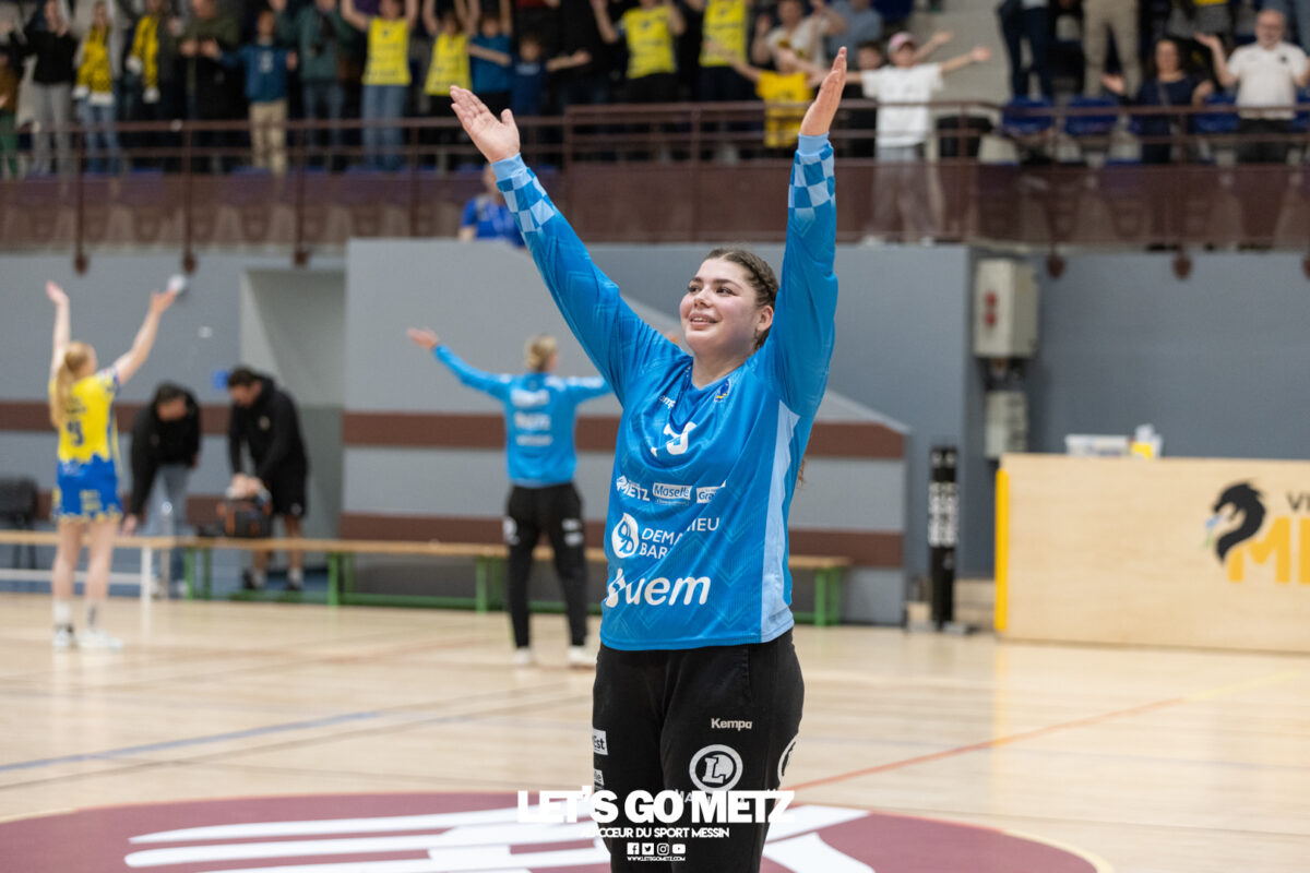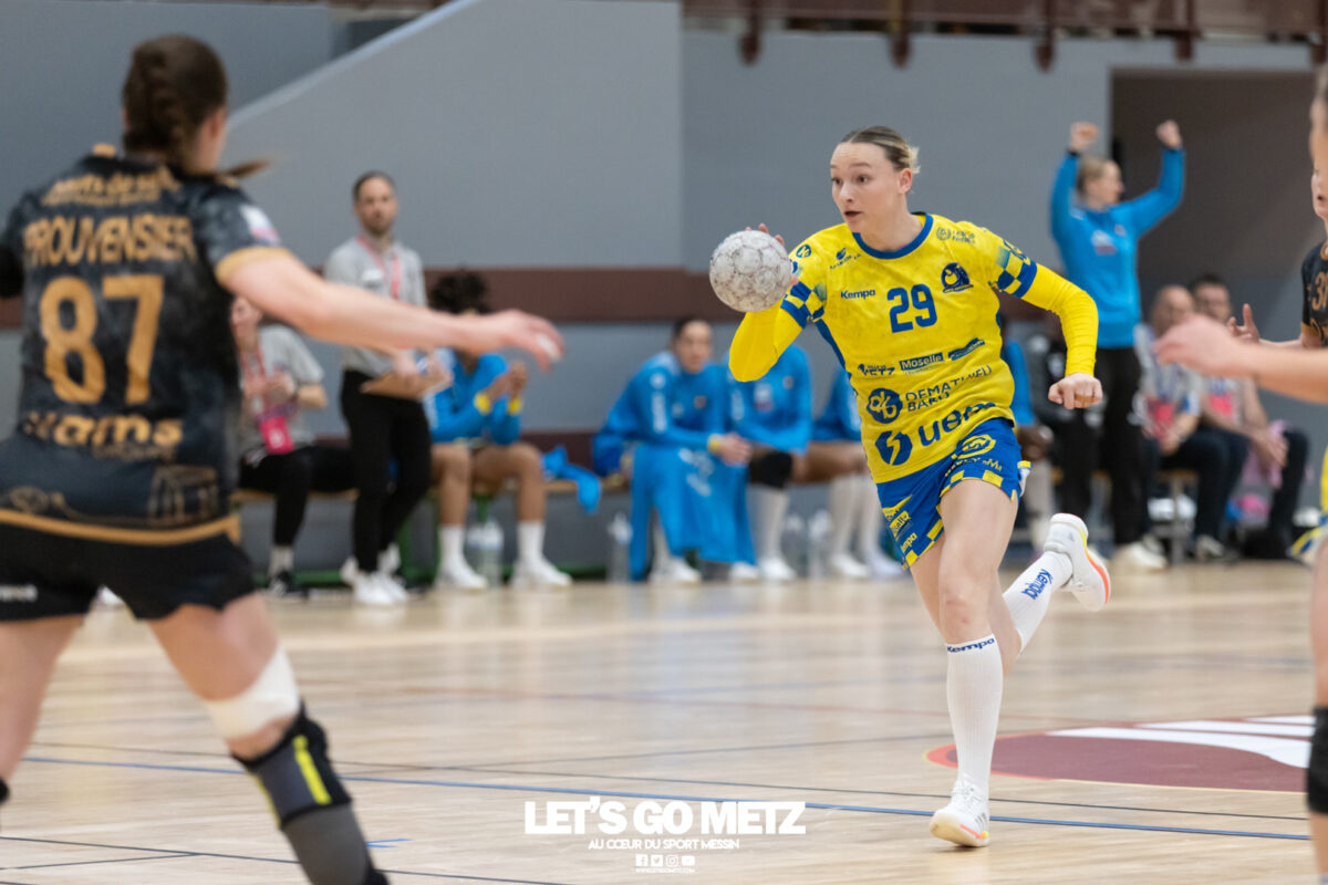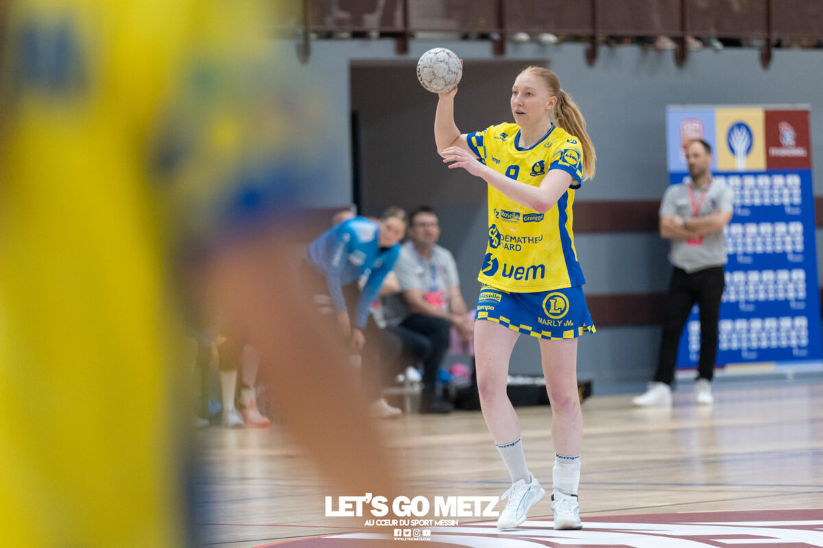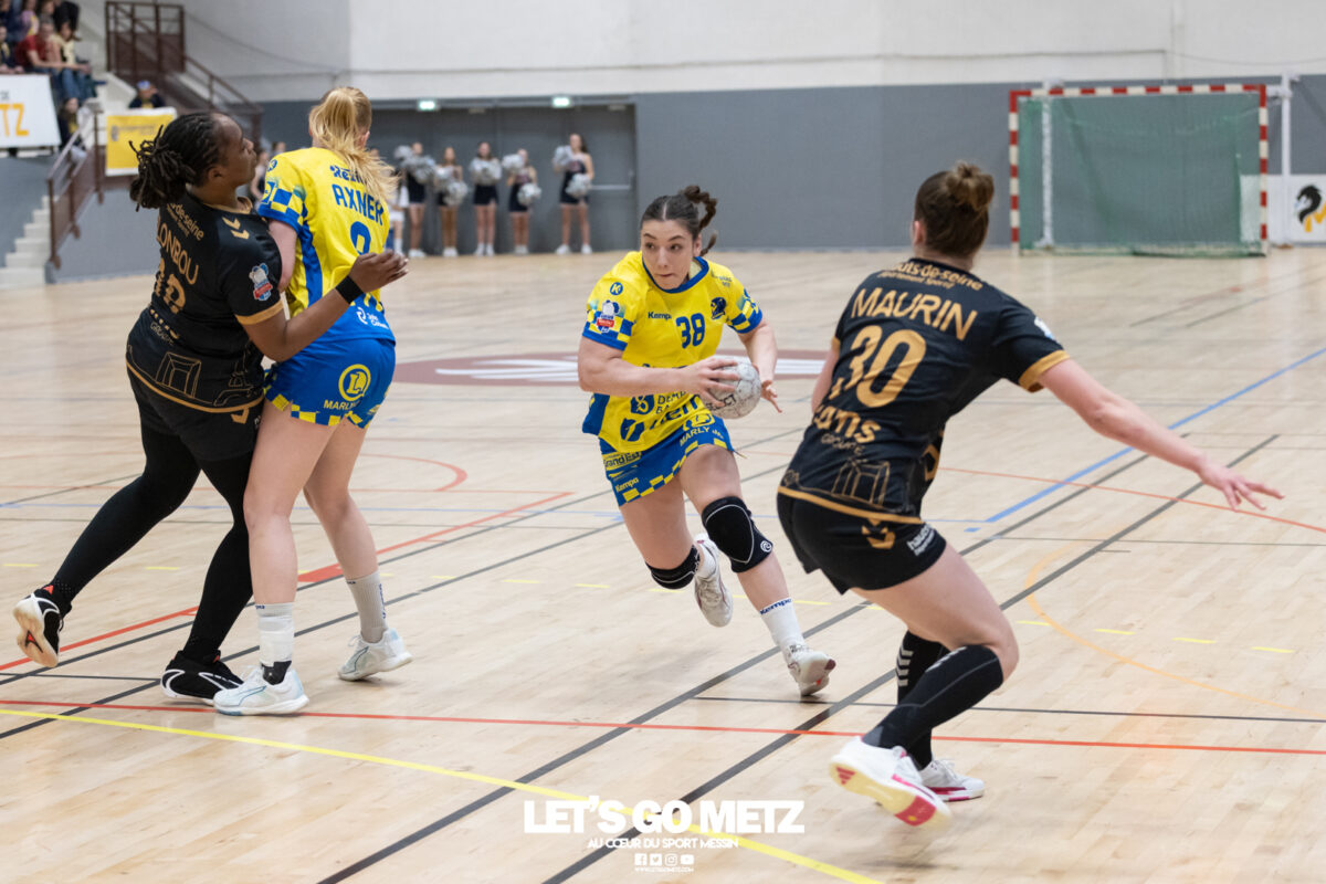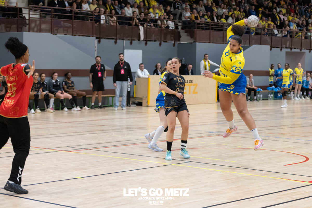 226 Ce samedi, Metz Handball s’est imposé face à Paris 92 et disputera sa cinquième finale de Coupe de France consécutive le 24 mai prochain. Après avoir battu son grand rival brestois fin février en quarts de finale, Metz Handball est devenu le grand favori à sa succession. Statut parfaitement assumé par les Dragonnes qui n’ont laissé aucun espoir à Paris 92 en s’imposant de dix-huit buts. Une victoire qui permet au club lorrain de rejoindre l’Accor Arena et y disputer sa cinquième finale de rang en Coupe de France. Si face à Nice mercredi, les partenaires de Chloé Valentini avaient rendu une copie moyenne dans le jeu, cette fois, elles se sont montrées impitoyables des deux cotés du terrain pour des Parisiennes sans solutions, davantage encore que lors des deux confrontations en championnat. Tyra Axner a fait parler son bras Paris 92 a bien mené au score dans cette rencontre grâce à un but de leur meilleure réalisatrice en Ligue Butagaz Energie, Coura Kanouté. Mais, avec la prestation de l’arrière Mathilde Plotton, ce seront sans doute les seuls motifs de satisfaction des filles de Naïm Sarni tant Metz Handball se muait en rouleau compresseur tout au long de cette demi-finale. Tyra Axner, Manon Errard, Sarah Bouktit et Grâce Zaadi créaient d’entrée un écart de trois unités (4-1, 6e). Suzanne Wajoka y allait même de son doublé après une réduction du score par la capitaine des Lionnes, Barbara Moretto (6-2, 8e). Tout semblait aller pour le mieux dans le meilleur des monde pour les Jaune et Bleu mais deux buts encaissés consécutivement agaçaient Emmanuel Mayonnade qui posait un temps mort. Une mise au point rapide mais qui lançait définitivement le TGV lorrain. En effet, bien que Marie Prouvensier et Mathilde Plotton parvenaient à tromper la vigilance de Johanna Bundsen, la gardienne suédoise se montrait solide dans ses cages (11 arrêts à 50%). Cette solidité, conjuguée à la précision de Tyra Axner, Lucie Granier, Petra Vamos et Sarah Bouktit, offrait un pécule de huit buts d’avance aux Messines à la pause (19-11, 30e). Sarah Bouktit une nouvelle fois irrésistible La pivot internationale, auteure de trois buts au cours de cette première moitié de match, ne comptait pas s’arrêter en si bon chemin. C’est elle qui ouvrait les hostilités du second acte avant de donner du spectacle en enchainant les combinaisons en contre attaque avec Chloé Valentini, notamment, et en se montrant implacable au jet de sept mètres. La future joueuse de Gyôr inscrivait finalement dix buts permettant à l’écart de gonfler inexorablement. Celui-ci atteignait les vingt buts (38-18, 55e) après que Grâce Zaadi ne trouve à nouveau le chemin des filets de Paris 92. Au relais de Tyra Axner, Betchaidelle Ngombele était également une grande artisane de ce festival offensif pendant que Sabrina Novotna restait dans la lignée de sa binôme avec neuf parades. Metz Handball s’imposait finalement de dix-huit buts (41-23) et se rapprochait d’un nouveau trophée avec cette finale de Coupe de France qui se profile le 24 mai prochain à 17 h 45. Les Dragonnes seront opposées à Dijon qui a éliminé Chambray ce samedi (31-25). Lylou Borg et Manon Errard peuvent désormais partir rejoindre l’équipe de France avec sérénité pendant que les autres internationales tricolores resteront cette fois à disposition de leur coach et commenceront à préparer la double confrontation qui les attend face au FTC Budapest, les 19 et 25 avril 2026 en quarts de finale de Champions League. La galerie de la rencontre Statistiques du match Metz HandballBundsen (11 parades sur 22 tirs), Novotna (9/21)Valentini (3 buts sur 3 tirs), Axnér (5/6), Wajoka (2/2), Anne-Emmanuelle Augustine (1/1), Ngombele (4/5), Bouktit (10/11), Granier (5/5), Grandveau (1/1), Vamos (3/5), Borg (1/1), Zaadi (3/3), Errard (3/4).Exclusions : Grandveau (3e), Errard (55e) Paris 92Foggea (3 parades/35 tirs), Kabeya-Tshisola (1/10)Nooitmeer, Golvet (0 but sur 4 tirs), Kanouté (5/10), Blonbou (0/2), Plotton (8/11), Moretto (1/5), Thudot, Hansson (1/3), Maurin (1/2), Wierzba (4/8), Thobor (1/2), Prouvensier (2/4)Exclusion : Golvet (23e) Crédits photos: Matthieu Henkinet / Let’s Go Metz