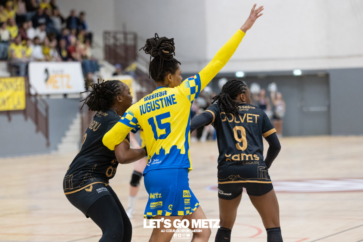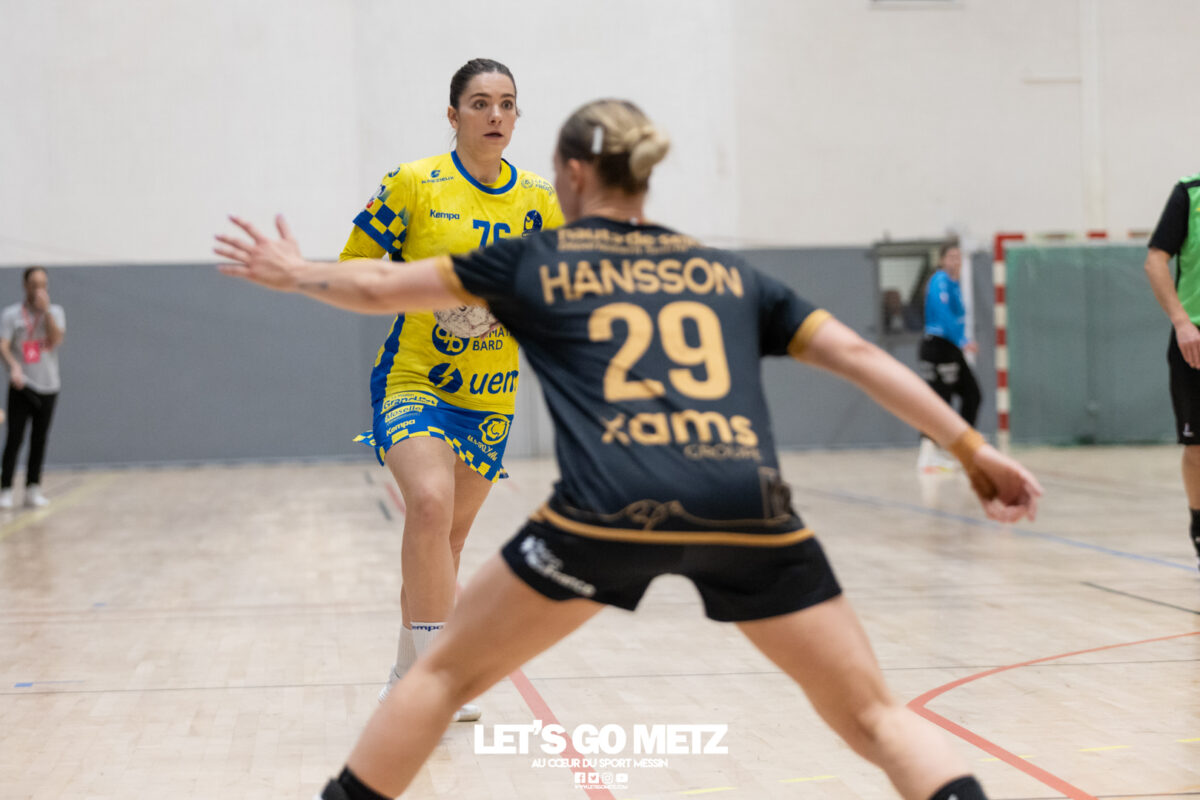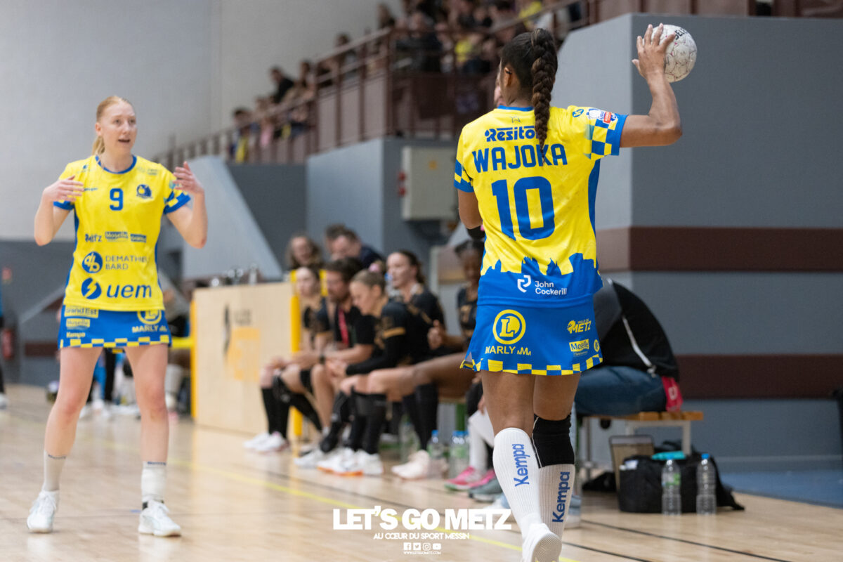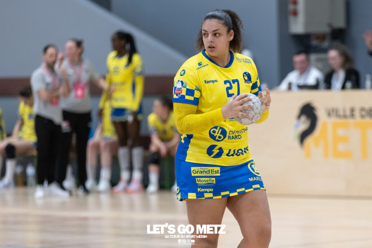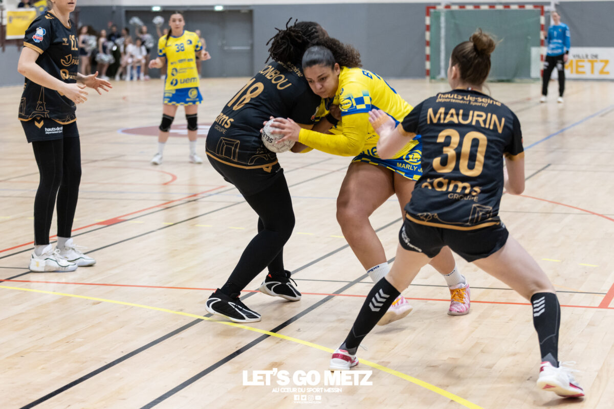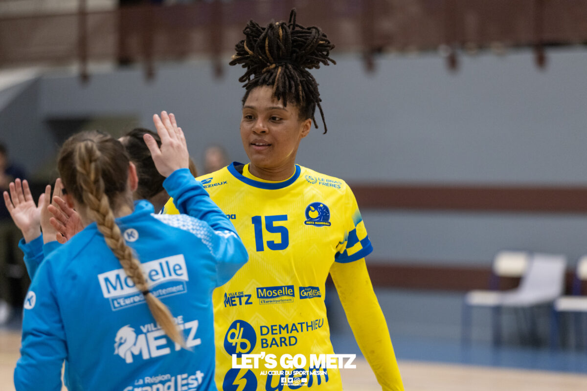 226 Ce samedi, Metz Handball s’est imposé face à Paris 92 et disputera sa cinquième finale de Coupe de France consécutive le 24 mai prochain. Après avoir battu son grand rival brestois fin février en quarts de finale, Metz Handball est devenu le grand favori à sa succession. Statut parfaitement assumé par les Dragonnes qui n’ont laissé aucun espoir à Paris 92 en s’imposant de dix-huit buts. Une victoire qui permet au club lorrain de rejoindre l’Accor Arena et y disputer sa cinquième finale de rang en Coupe de France. Si face à Nice mercredi, les partenaires de Chloé Valentini avaient rendu une copie moyenne dans le jeu, cette fois, elles se sont montrées impitoyables des deux cotés du terrain pour des Parisiennes sans solutions, davantage encore que lors des deux confrontations en championnat. Tyra Axner a fait parler son bras Paris 92 a bien mené au score dans cette rencontre grâce à un but de leur meilleure réalisatrice en Ligue Butagaz Energie, Coura Kanouté. Mais, avec la prestation de l’arrière Mathilde Plotton, ce seront sans doute les seuls motifs de satisfaction des filles de Naïm Sarni tant Metz Handball se muait en rouleau compresseur tout au long de cette demi-finale. Tyra Axner, Manon Errard, Sarah Bouktit et Grâce Zaadi créaient d’entrée un écart de trois unités (4-1, 6e). Suzanne Wajoka y allait même de son doublé après une réduction du score par la capitaine des Lionnes, Barbara Moretto (6-2, 8e). Tout semblait aller pour le mieux dans le meilleur des monde pour les Jaune et Bleu mais deux buts encaissés consécutivement agaçaient Emmanuel Mayonnade qui posait un temps mort. Une mise au point rapide mais qui lançait définitivement le TGV lorrain. En effet, bien que Marie Prouvensier et Mathilde Plotton parvenaient à tromper la vigilance de Johanna Bundsen, la gardienne suédoise se montrait solide dans ses cages (11 arrêts à 50%). Cette solidité, conjuguée à la précision de Tyra Axner, Lucie Granier, Petra Vamos et Sarah Bouktit, offrait un pécule de huit buts d’avance aux Messines à la pause (19-11, 30e). Sarah Bouktit une nouvelle fois irrésistible La pivot internationale, auteure de trois buts au cours de cette première moitié de match, ne comptait pas s’arrêter en si bon chemin. C’est elle qui ouvrait les hostilités du second acte avant de donner du spectacle en enchainant les combinaisons en contre attaque avec Chloé Valentini, notamment, et en se montrant implacable au jet de sept mètres. La future joueuse de Gyôr inscrivait finalement dix buts permettant à l’écart de gonfler inexorablement. Celui-ci atteignait les vingt buts (38-18, 55e) après que Grâce Zaadi ne trouve à nouveau le chemin des filets de Paris 92. Au relais de Tyra Axner, Betchaidelle Ngombele était également une grande artisane de ce festival offensif pendant que Sabrina Novotna restait dans la lignée de sa binôme avec neuf parades. Metz Handball s’imposait finalement de dix-huit buts (41-23) et se rapprochait d’un nouveau trophée avec cette finale de Coupe de France qui se profile le 24 mai prochain à 17 h 45. Les Dragonnes seront opposées à Dijon qui a éliminé Chambray ce samedi (31-25). Lylou Borg et Manon Errard peuvent désormais partir rejoindre l’équipe de France avec sérénité pendant que les autres internationales tricolores resteront cette fois à disposition de leur coach et commenceront à préparer la double confrontation qui les attend face au FTC Budapest, les 19 et 25 avril 2026 en quarts de finale de Champions League. La galerie de la rencontre Statistiques du match Metz HandballBundsen (11 parades sur 22 tirs), Novotna (9/21)Valentini (3 buts sur 3 tirs), Axnér (5/6), Wajoka (2/2), Anne-Emmanuelle Augustine (1/1), Ngombele (4/5), Bouktit (10/11), Granier (5/5), Grandveau (1/1), Vamos (3/5), Borg (1/1), Zaadi (3/3), Errard (3/4).Exclusions : Grandveau (3e), Errard (55e) Paris 92Foggea (3 parades/35 tirs), Kabeya-Tshisola (1/10)Nooitmeer, Golvet (0 but sur 4 tirs), Kanouté (5/10), Blonbou (0/2), Plotton (8/11), Moretto (1/5), Thudot, Hansson (1/3), Maurin (1/2), Wierzba (4/8), Thobor (1/2), Prouvensier (2/4)Exclusion : Golvet (23e) Crédits photos: Matthieu Henkinet / Let’s Go Metz