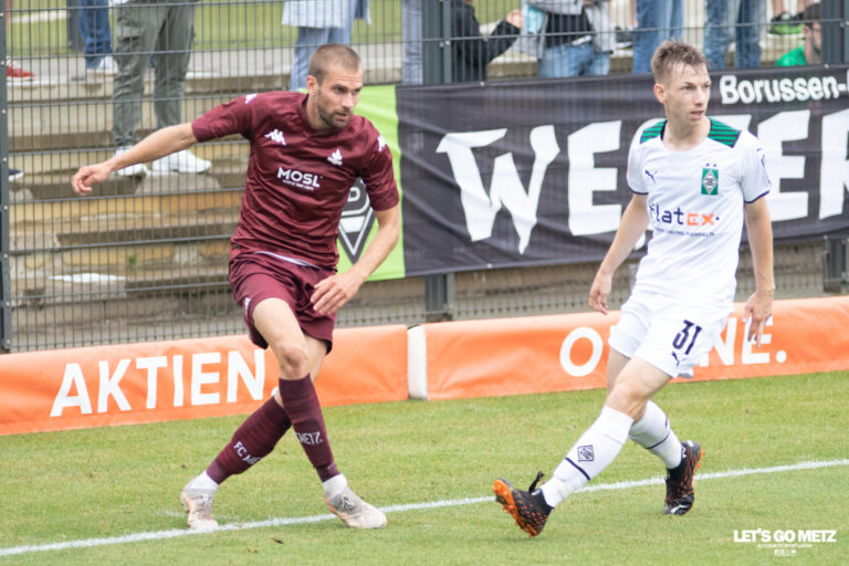 624 Dans le cadre de sa préparation estivale, le FC Metz s’est incliné 1-0 en amical sur le terrain du Borussia Möchengladbach. Let’s Go Metz a fait pour vous le déplacement jusqu’en Rhénanie-du-Nord-Westphalie. Retour sur notre voyage à Möchengladbach. Samedi 24 juillet, le FC Metz va disputer son troisième match amical de l’été. Au programme, un déplacement de gala à Mönchengladbach. Le Borussia, récent 1/8ème de finaliste de Ligue des Champions, est en effet l’un des clubs les plus prestigieux de Bundesliga.Die Fohlen (les poulains), comme on les surnomme, comptent à leur actif un palmarès plutôt impressionnant : 5 titres de champions d’Allemagne (1970, 1971, 1975, 1976, 1977)3 coupes d’Allemagne (1960, 1973, 1995)2 coupes de l’UEFA (1975, 1979) Un club historique de Bundesliga, donc. Néanmoins, le Borussia Mönchengladbach a connu une petite crise dans son histoire récente, qui l’a conduit à faire l’ascenseur plusieurs fois au début des années 2000 (ça vous rappelle quelqu’un ?). Le club s’est malgré tout stabilisé en Bundesliga depuis une dizaine d’années avant de retrouver les hautes sphères du championnat germanique. Le départ pour Mönchengladbach Cette rencontre entre le Borussia Mönchengladbach et le FC Metz, certes anecdotique sur le plan sportif, était donc un évènement que nous ne pouvions pas manquer. Nous avons alors pris la route vers l’Allemagne ce samedi aux alentours de 9h30. Au programme, environ 3h30 de route. La photo a bien sûr été prise côté passager, on ne blague pas avec la sécurité routière. La pluie n’aide guère le conducteur mais la bonne humeur dans le véhicule n’est pas entamée. Comme de bons mangeurs qui se respectent, nous décidons de faire une pause après 2h30 de route environ, non loin de Liège en Belgique. Qui dit Belgique, dit frites ! Nous mangeons dans une friterie traditionnelle, où la qualité de la frite n’a que peu d’égal. Le hamburger fait office d’accompagnement tant la barquette de frites est la star du repas. Le coca-cola avait cependant un goût de seum. L’arrivée à Mönchengladbach Pardonnez cet aparté Top Chef, nous revenons à nos moutons, ou plutôt à nos poulains. Nous arrivons au pied du Borussia Park aux alentours de 14h après avoir bien profité du repas et pris notre temps sur la route pour arriver en toute sécurité. Un stade fort joli que nous n’avons pas eu le plaisir de découvrir de l’intérieur malheureusement. Les Grenats ont en effet joué sur le terrain annexe du Borussia, le Fohlenplatz (littéralement place des poulains), l’équivalent de notre stade Dezavelle. Photo : DR Le contexte n’en est pas moins fort sympathique. Idem pour le cadre footballistique où, sur une étendue immense, on trouve également le centre d’entraînement du Borussia Mönchengladbach. Quasiment comme le projet Frescaty, à l’exception du Stade Saint-Symphorien qui demeure bien sûr là où il est.Nous prenons nos quartiers près de ce petit terrain, après l’achat de la classique bière quand on parle de football outre-Rhin, alors que les supporters allemands et français (oui, il y avait quelques messins) commencent petit à petit à gagner leur place. Mönchengladbach – Metz : Le match Côté terrain, les Grenats avaient affaire à un gros morceau. Frédéric Antonetti a aligné une équipe quasiment type, à l’exception peut-être du prodige Pape Matar Sarr qui figurait sur le banc.Côté Gladbach, on retrouve un XI plutôt mixte en raison des absences de son international français Marcus Thuram et de sa diaspora suisse (Sommer, Elvedi, Zakaria, Embolo…). Le français Alassane Pléa figure en revanche bien dans le XI des Poulains. Crédit : FC MetzCrédit : Borussia Mönchengladbach Les hommes d’Adi Hütter dominent logiquement les messins en première période. Néanmoins, le FC Metz plie mais ne rompt pas ! Grâce à plusieurs sauvetages décisifs en défense, les Grenats repartent à la pause avec un score de 0-0 dans la besace. Les poulains poussent 💥#DieFohlen #BMGFCM 0-0 (22e) pic.twitter.com/qU5jJ7guTu— Gladbach (@borussia_fr) July 24, 2021 Une deuxième période encourageante A l’issue de cette première mi-temps dominée pour les poulains, le FC Metz est revenu avec d’autres intentions. Le réveil messin a toutefois été facilité par les 10 changements allemands à la pause, quand Antonetti n’en a effectué que trois. Nous assistons alors à une nette domination du FC Metz face aux jeunes joueurs du Borussia, ce qui n’entame pas la bonne humeur de l’international français Marcus Thuram. Photo : Borussia Mönchengladbach Malgré les assauts de Delaine, Joseph, Sarr, Sabaly ou encore Bronn, le FC Metz va se faire surprendre. Contre le cours du jeu, les Grenats encaissent le 1-0 à la 87ème minute par Noss. Le but du jour signé Connor #Noß 🆚 @FCMetz 📹 #BMGFCM #DieFohlen 💚🐎 pic.twitter.com/ktCaqCZyVB— Gladbach (@borussia_fr) July 24, 2021 Le coup est dur pour les joueurs du club à la Croix de Lorraine mais on sait que l’essentiel dans ce genre de rencontres est de mettre des choses en place dans le jeu afin d’être paré pour le début de saison. L’instant touriste Photo : Julien Buret Pas rancuniers, nous nous dirigeons vers la boutique du Borussia Mönchengladbach après la rencontre. L’étonnement est total devant la beauté de l’agencement d’une part, et devant la multitude d’articles proposés d’autre part.Outre les classiques maillots de la saison à venir, avec flocage ou non, le club vend des maillots des saisons précédentes (certains spécialement pour la Ligue des Champions) à des prix très abordables (20€ – 30€ – 40€). On trouve également des écharpes ou autre traditionnels équipements pour les fans.Le club allemand commercialise aussi des produits insolites comme des bouteilles de bière ou de gin (avec modération) à l’effigie du Borussia