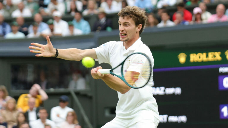 1,K Ugo Humbert n’a pas réussi à battre le tenant du titre, Carlos Alcaraz, à Wimbledon. Défaite en quatre sets du Messin, malgré un très bon match. Toutes les bonnes choses ont une fin, comme le parcours du Messin Ugo Humbert à Wimbledon. Qualifié pour la deuxième fois de sa carrière pour les huitièmes de finale à Londres, le Français n’a pas su rivaliser avec l’Espagnol. Face à des joueurs de la trempe d’Alcaraz, il faut être dans un grand jour pour espérer accrocher un résultat. Et Humbert l’a été durant un troisième set de haute voltige. Mais il n’a pas su convertir les quelques occasions de break qui se sont aussi présentées à lui. Il s’incline en quatre sets (6/3, 6/4, 1/6, 7/5). Carlos Alcaraz tombeur d’Ugo Humbert dans un match sérieux du Messin – Photo by Icon Sport Humbert quitte sans surprise cette édition 2024 de Wimbledon, face à un gros morceau. Mais son très bon parcours cette année est à saluer, et le Français s’est très bien battu face au numéro 3 mondial. Cap sur les Jeux Olympiques de Paris 2024 pour Ugo Humbert Ugo Humbert – Photo by Icon Sport Après cette élimination, le Mosellan va désormais pouvoir se concentrer sur les Jeux Olympiques de Paris 2024. Les épreuves de tennis, qui se dérouleront à Roland-Garros, seront disputées sur terre battue. Une surface qui lui convient moins, mais qu’il a su apprivoiser ces dernières années pour améliorer ses résultats.