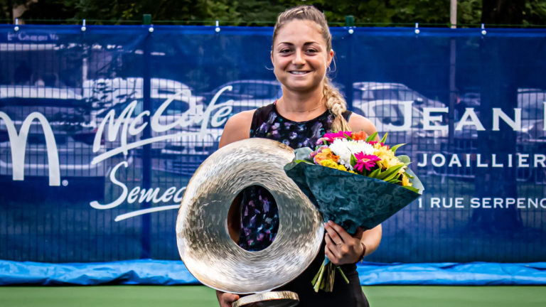 390 C’est désormais officiel, Margot Yerolymos succède à Chloé Paquet en devenant la grande gagnante du Waves Open 57, édition 2021. Qu’elle s’emble loin désormais l’élimination face à Myrtille Georges lors des quarts de finale en 2019. Depuis, de l’eau a coulé sous les points et Margot Yerolymos n’a pas perdu de temps à la regarder défiler. Agée de 24 ans, elle se présentait cette fois à Moulins les Metz en tant que tête de série numéro 2, forte d’une 14ème place au classement Français et le moins qu’on puisse dire c’est qu’elle n’a pas déçu. Implacable, elle écartait Joanna Tomera dès son entrée en compétition en 8ème de finale (6/1, 6/3) avant de s’affranchir de Schena Benamar en quart de finale (6/2, 6/3), puis d’Emmanuelle Girard lors de la demi finale (6/2, 6/1). Si le hasard du tournoi lui a permis d’éviter la route de joueuses classées au profit de joueuses combatives mais évoluant habituellement un cran en dessous, Margot Yerolymos a su éviter les pièges jusqu’à la finale ou elle a retrouvé une pointure en la personne de Gaelle Desperrier, tête de série numéro 4 et 21ème au classement Français. Peu connue du grand public, la joueuse de 33 ans écume pourtant les tournois nationaux de longue date et est réputée être un tirage compliqué. Tombeuse d’Aravane Rezai (5/0, abandon), Lucie Wargnier (6/2, 6/4) et Priscilla Heise (6/3, 4/6, 6/0), elle se présentait ce Dimanche 04 Juillet avec des ambitions bien marquées. Duel face à la météo, le match dans le match Malgré un début de rencontre très accroché, c’est la météo qui a régi le rythme du match avec des averses fréquentes sur le court principal du complexe de la saussaie occasionnant plusieurs suspensions de rencontre, à 2-2 puis à 2-4. Une situation qui permettait à Gaelle Desperrier de prendre l’avantage de la première manche 2/6 tandis que Margot Yerolymos perdait de son habituelle concentration et se mettait fréquemment à la faute. Cette dernière, peu à l’aise sur un terrain glissant montrait également quelques signes d’agacement alors qu’elle s’était montrée particulièrement impassible et mécanique dans son jeu tout au long du tournoi. Dès le début du deuxième set, alors que Margot Yerolymos s’emparait d’une balle de break, la partie était à nouveau interrompue et contraignait l’organisation à un repli vers un court intérieur. Un changement de contexte manifestement favorable à la joueuse originaire de Martigues qui retournait la partie à sa faveur avec un très sérieux 6/2 pour s’adjuger la deuxième manche. De plus en plus précise, Margot Yerolymos retrouvait ses qualités de jeu et son impassibilité pour infliger un cinglant 6/0 à une Gaëlle Desperrier pour qui le caractère décousu de la rencontre et le repli sur un court différent ont été décisifs. En double, gloire à la paire Heise / Tholey Du côté du tournoi en double, c’est la paire Priscilla Heise / Léa Tholey qui s’est adjugée la finale en dominant Schena Benamar et Lucie Devier par deux sets : 6/3, 6/2.Ce match qui s’est déroulé sur le court intérieur a permis à Priscilla Heise d’effacer définitivement la déception d’une défaite en finale lors de l’édition 2018. Crédit photo : Lucas Deslangles